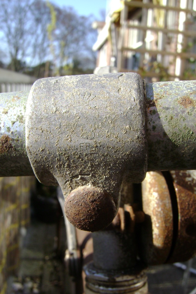Ik ben begonnen de roest voorzichtig van het frame te krabben, m.b.v. owatrol. De korst blijkt zo dik dat dit niet vanzelfsprekend meer is, helaas. Wonder boven wonder kwam er onder de roest toch hier en daar nog originele lak naar boven, met biezen en transfers!