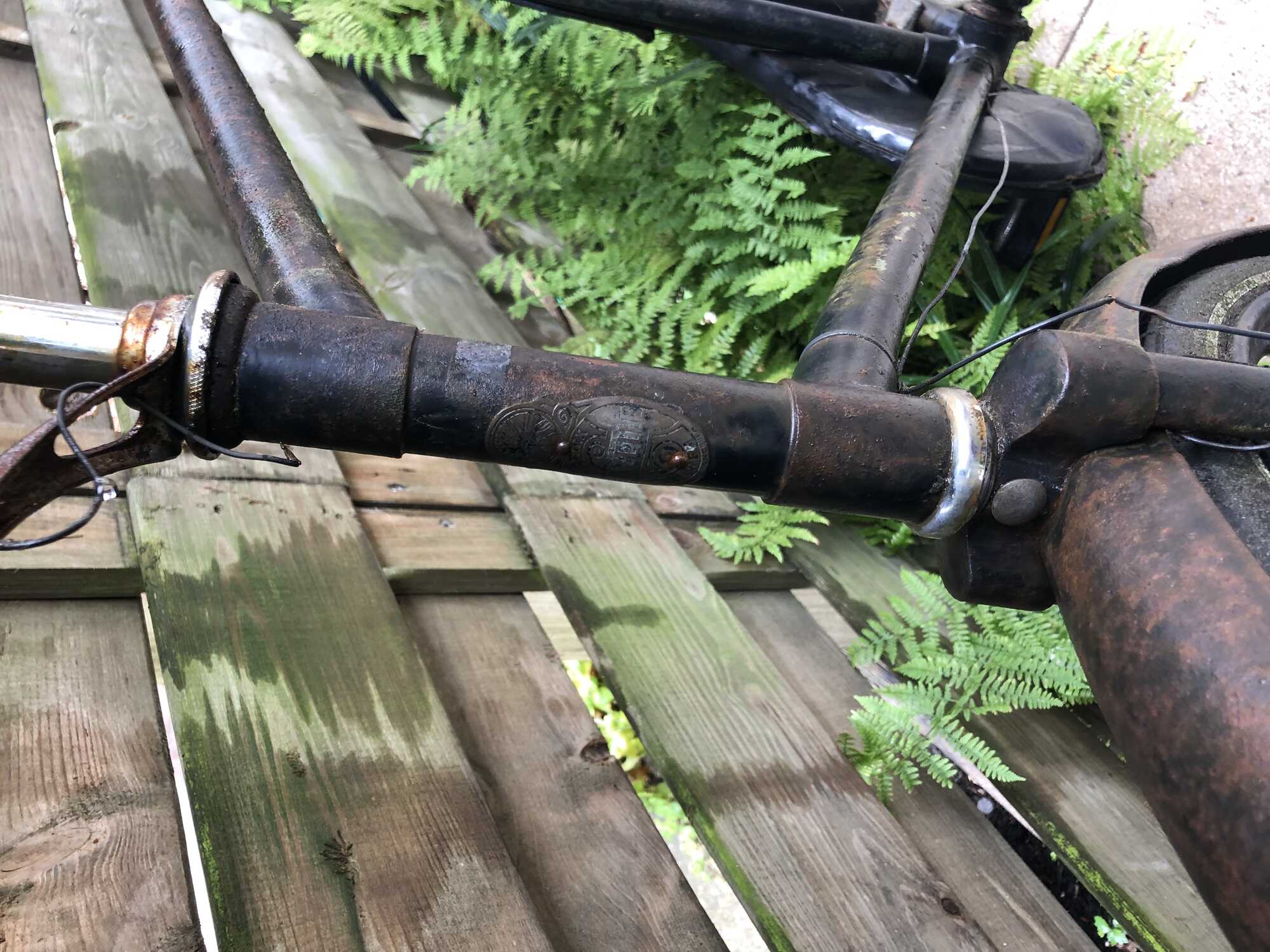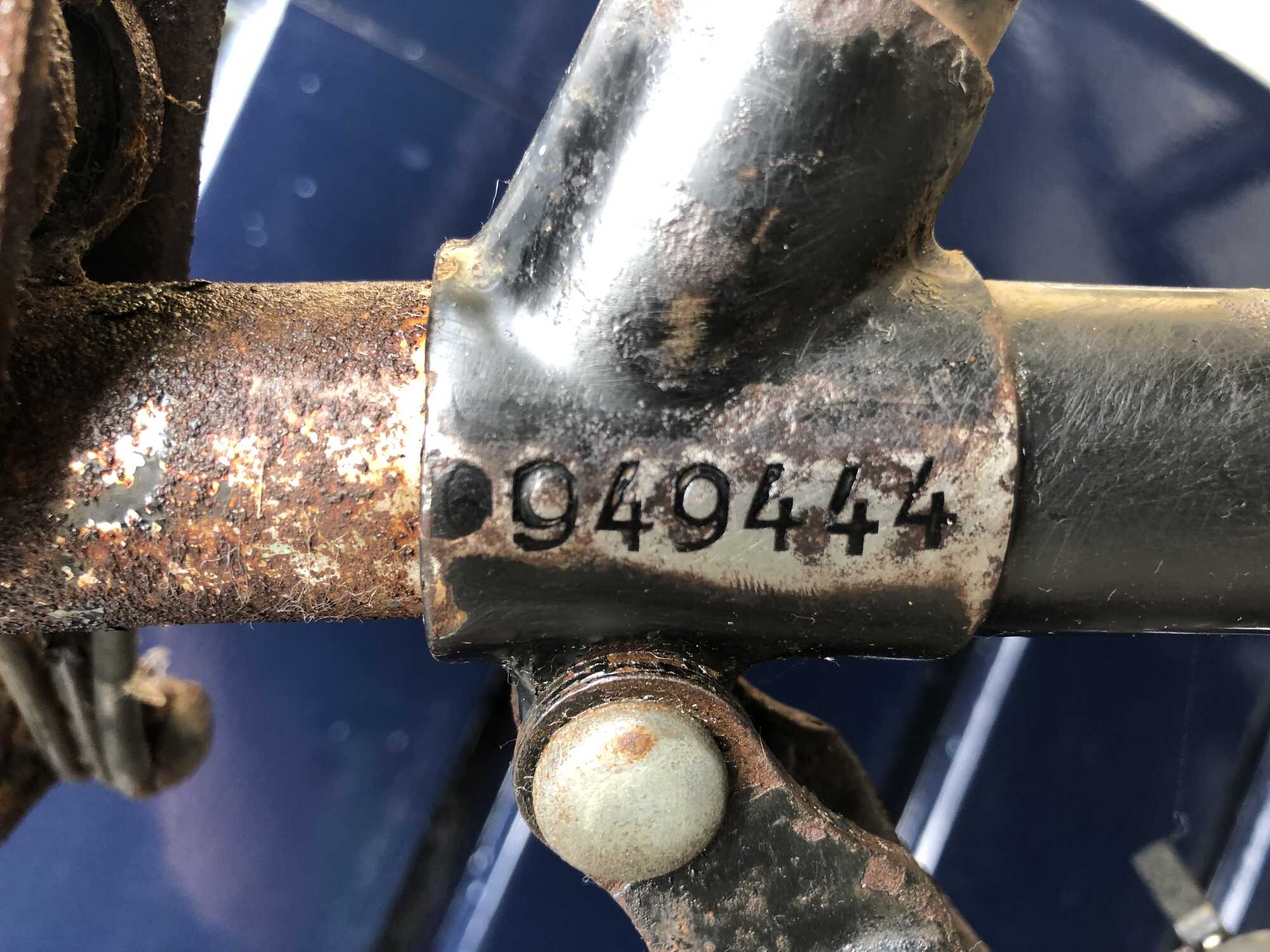 Aan de hand van het framenummer weet ik dat hij uit 1952 komt, verder weet ik nog niet veel dus alle hulp is welkom. De dynamo en koplamp zijn sowieso niet origineel, het achterlichtje is van ITM. De achternaaf is van HISTOP en dus ook niet origineel maar het lijkt alsof hij in de originele velg is gespaakt dus dat zou mooi zijn. Zadel is van lepper. Verder zijn de jasbeschermers en kettingkast ook niet op meer en is er een stuk van het stuur afgebroken, waar beginnen we aan haha.