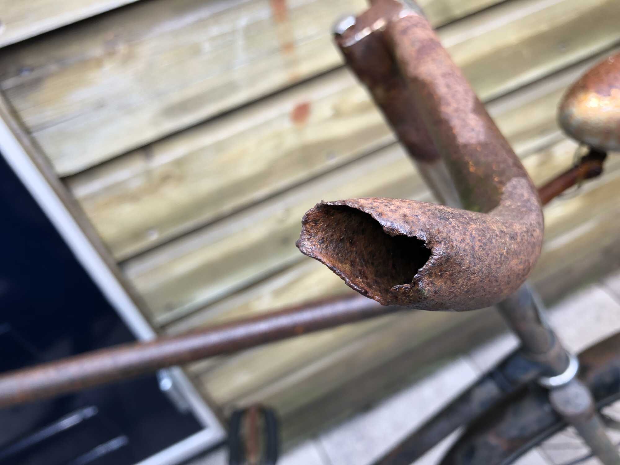 Je hebt gelijk! Viel me gisteren in de regen niet op maar het frame is behoorlijk opgelopen. Ik ben bang dat hij nu eerder naar donorfiets gaat dan naar restauratie maar ik ga eens uitzoeken of iemand dit nog onzichtbaar kan herstellen.