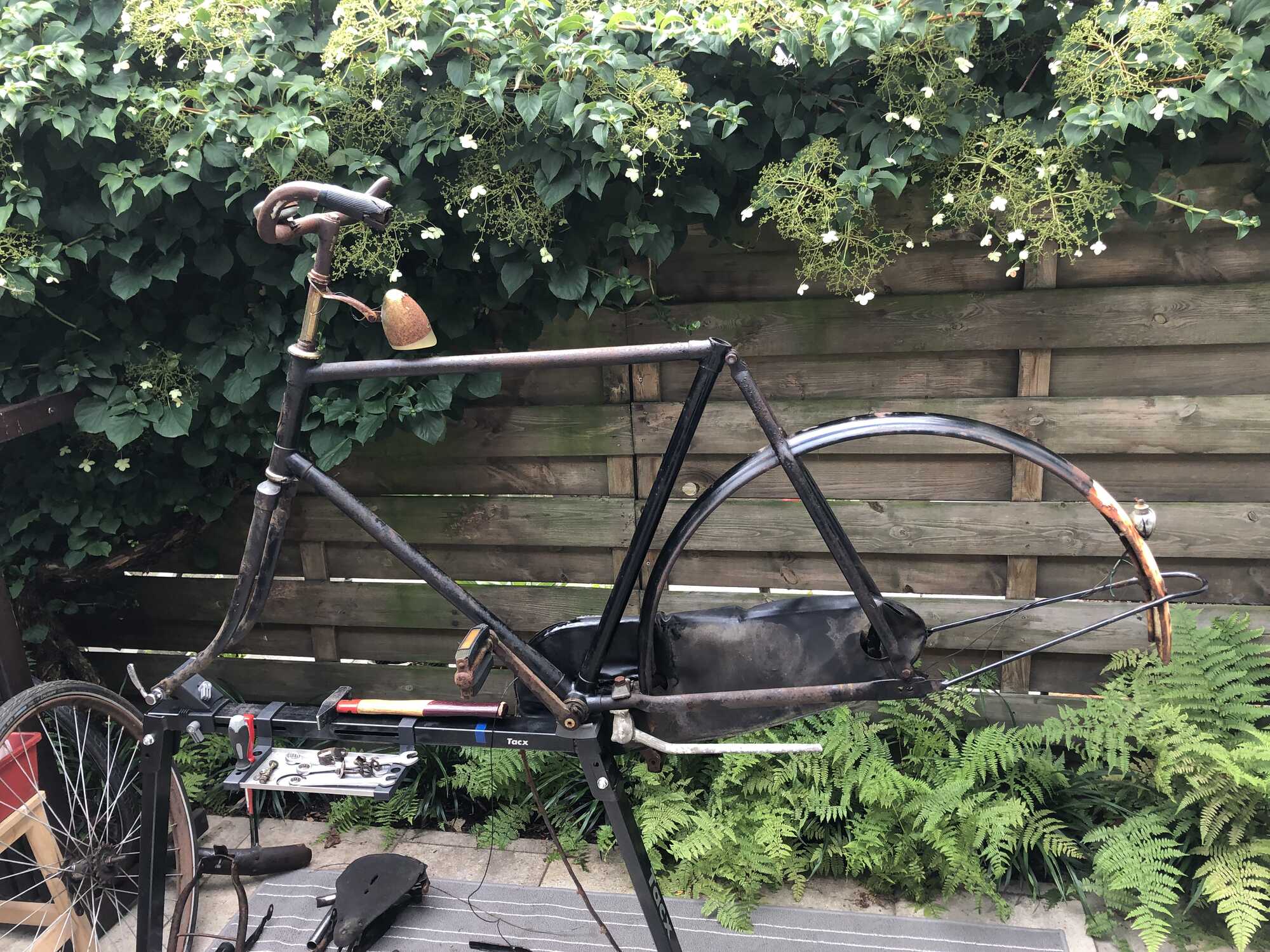 Klopt de foto’s spreken voor zich, het is een oude mishandelde half weg gerotte fiets met een waarde van 20 euro of minder. Ik heb al vrij veel aan oude auto’s gewerkt en dan stelt dit wat betreft roest etc weinig voor. Maar ik ga deze fiets niet restaureren. Is hij niet waard en hij is veel te slecht. Ik ga wel proberen om hem nieuw leven in te blazen en weer op de weg te krijgen. Leuker dan weg gooien toch?