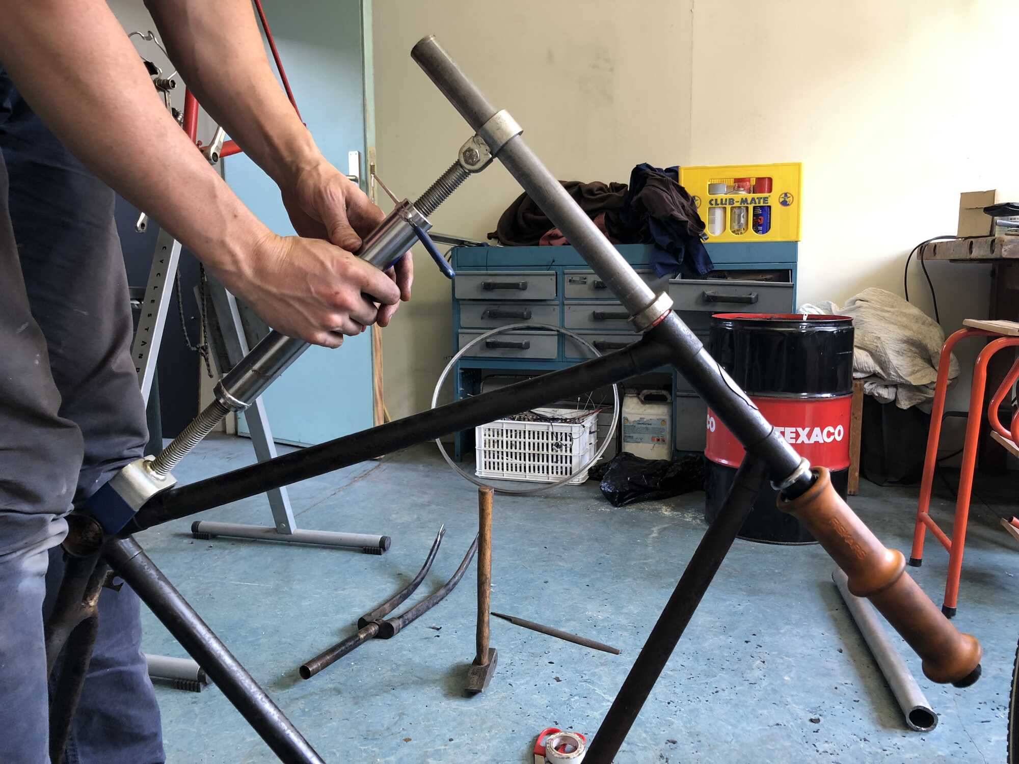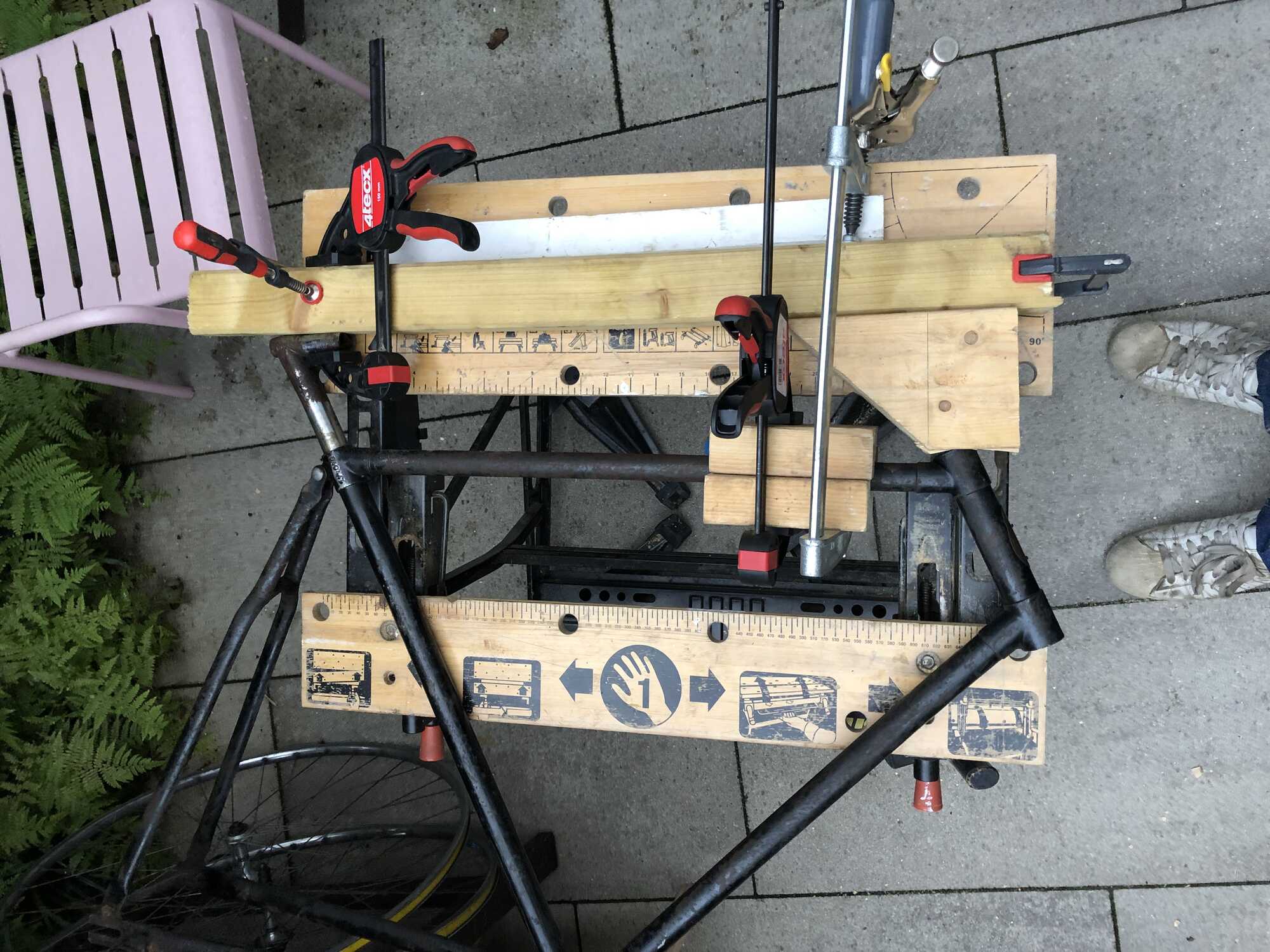 Nou, de eerste stap is gezet! Ik ben begonnen bij het begin: het frame zo veel mogelijk recht krijgen en de voorvork controleren. Gelukkig ken ik iemand met het goede gereedschap. Daarnaast zelf nog wat geïmproviseerde om de bovenbuis weer recht te tekken. Al met al viel het me niet tegen en is het frame weer behoorlijk recht!