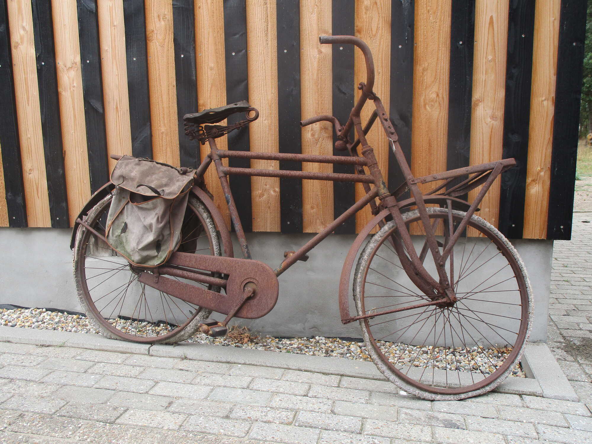 P.s. leuke transportfiets. Het is waarschijnlijk een vooroorlogse, te zien aan het model voordrager. En hij is nog vrij origineel, met originele transportpedalen en zadel. Wel zonde dat hij buiten staat weg te roesten.
