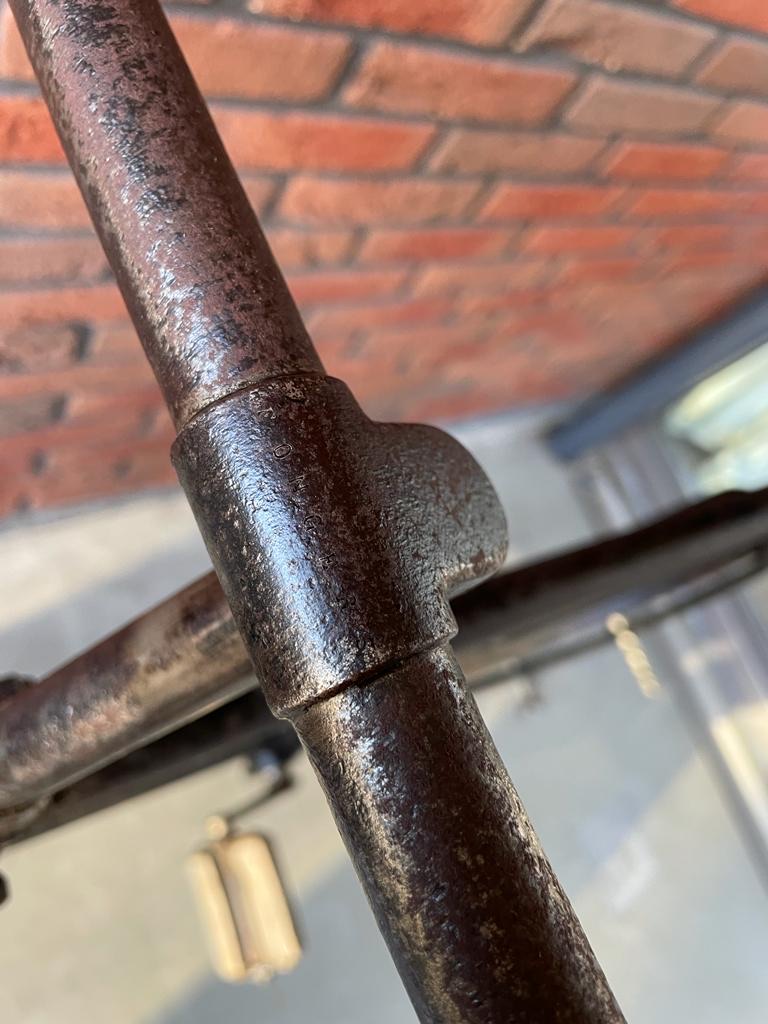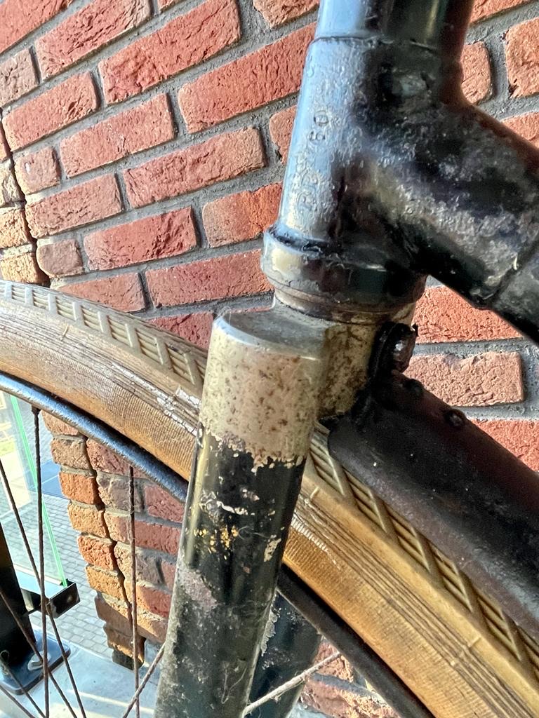 Het stuur op de foto lijkt zwart met nokjes waar ooit een remsysteem aan heeft gezeten. Een dergelijk stuur zit er nog steeds op hoewel het celluloid is verdwenen (delen er van zaten er nog op toen de fiets in 2007 boven water kwam begreep ik van Andre). En tot slot is de framemaat hetzelfde.