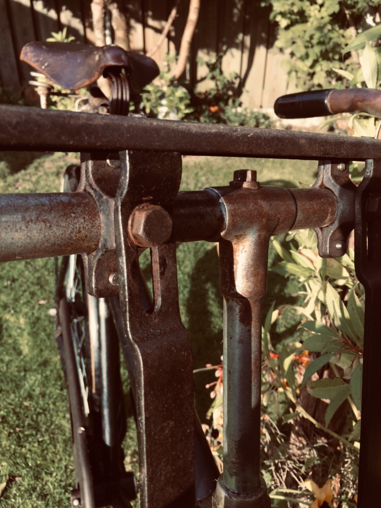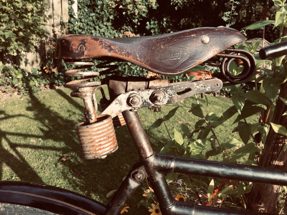 In de voorvelg zat een vervelende slag maar dankzij de stevige bankschroef heb ik dat op weten te lossen. Het frame van het zadel was van een toerfiets. Ik heb het leren dek van Hulshof op een zadelframe van Hulshof gemonteerd. Dat lag nog ergens in een doos. Een mooi frame maar de vorige eigenaar heeft er op een slordige manier een soort zilver- of aluminiumverf op gesmeerd. Daar wil ik nog wat aan doen maar ik moet nog bedenken wat