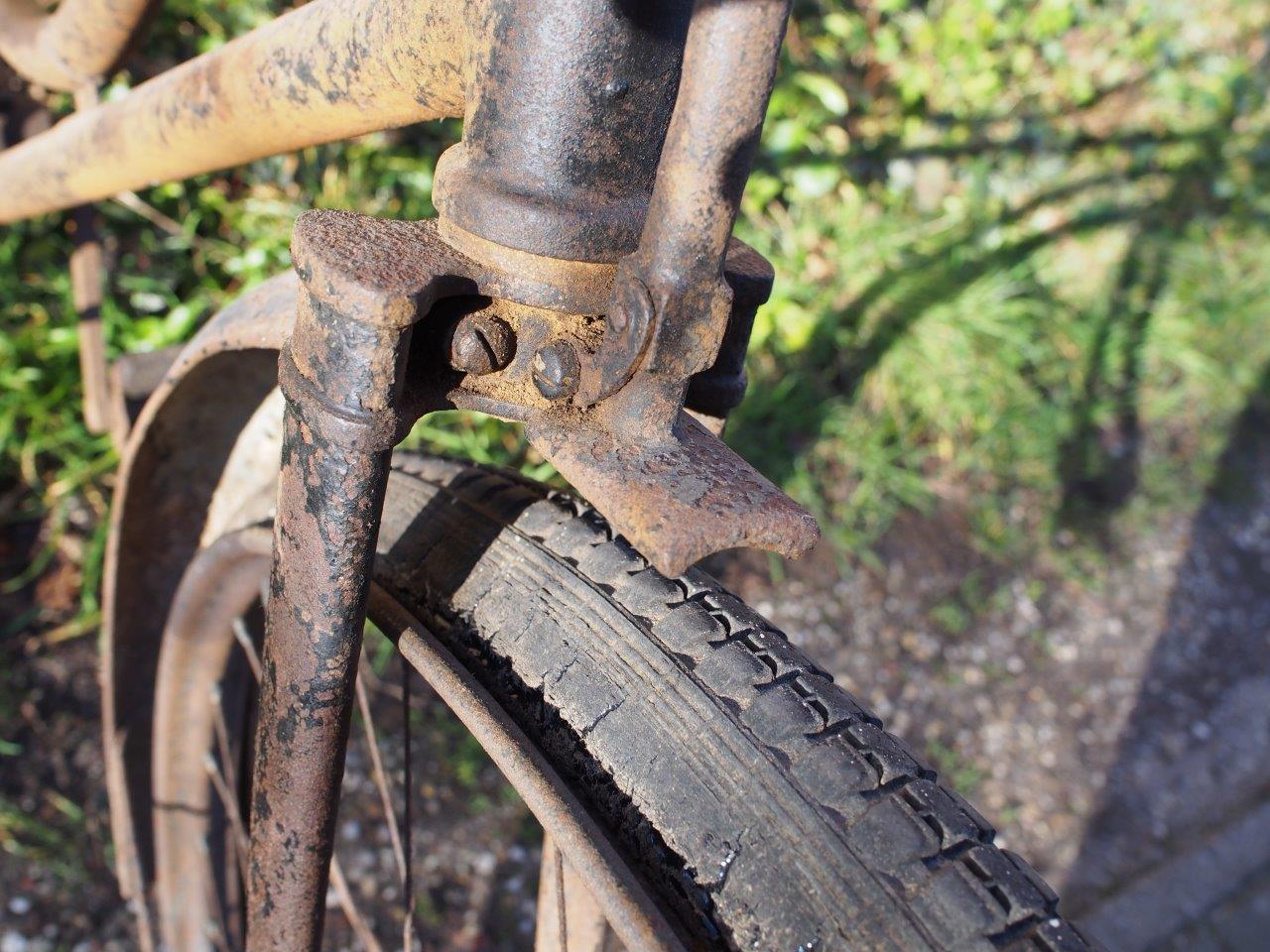 De versie met bandrem werd tot 1901 of 1902 gebouwd. Het op deze fiets gebruikte balhoofdplaatje werd in 1901 geintroduceerd en 5 jaar lang gebruikt. Hij heeft wel een Eadie terugtraprem, ik moet nog eens uitzoeken of die origineel kan zijn. Iemand hier op het forum die weet op de Eadie rem toen al werd gemaakt? Hoe dan ook blijft die rem er op zitten.