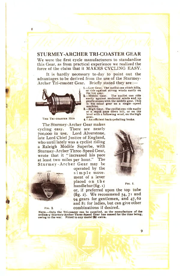 Ik vond op de Sturmey Archer site een stukje uit de Raleigh catalogus uit 1916 waarin ze onderaan schreven dat ze alleen nog maar de drieversnellingen met terugtraprem kunnen leveren maar dat de gewone drie versnellingen naaf helaas tijdelijk niet te leveren is in verband met de oorlogsinspannigen. Die gewone naaf van 1916 is de A naaf met driehoekige versteller.