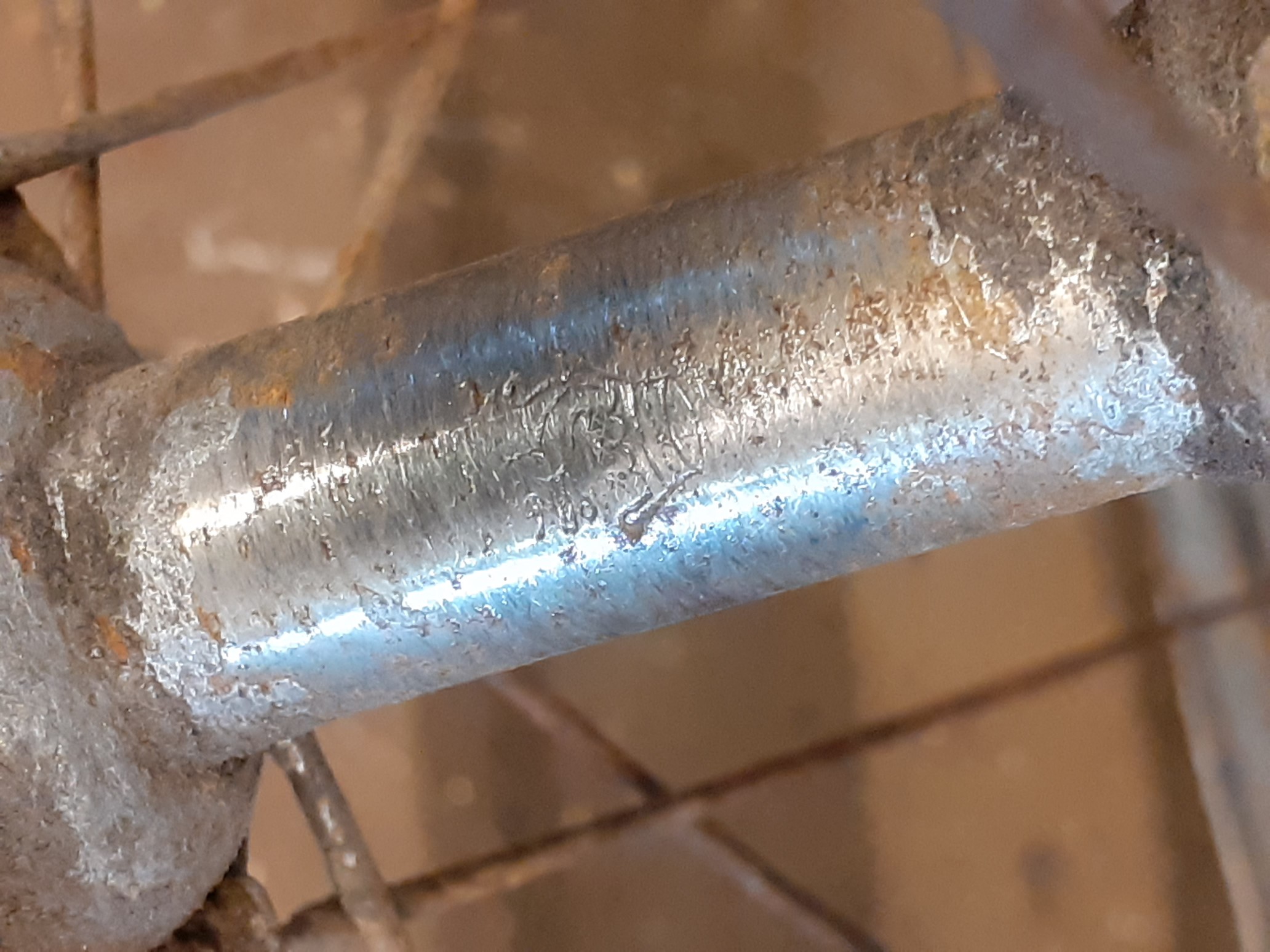 Als het een Juncker is vind je zeker letters en cijfers op het balhoofdstel, tenzij dit ook ooit vervangen is natuurlijk. Op de borgmoer hoort een kleine letter te staan op de onderkant. Dat zou dus de letter 'I' van het framenummer moeten zijn.