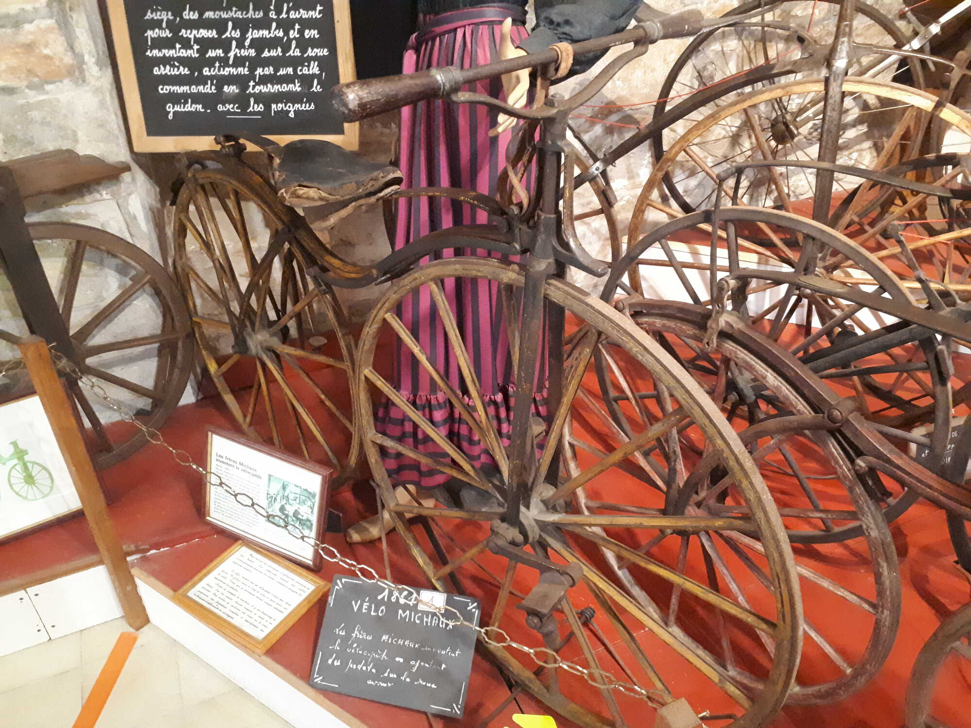 Ik zie diverse fraaie fietsen, tricycles, en inderdaad een hele vroege Michaux, eerste model. Bijzonder hoor!!!