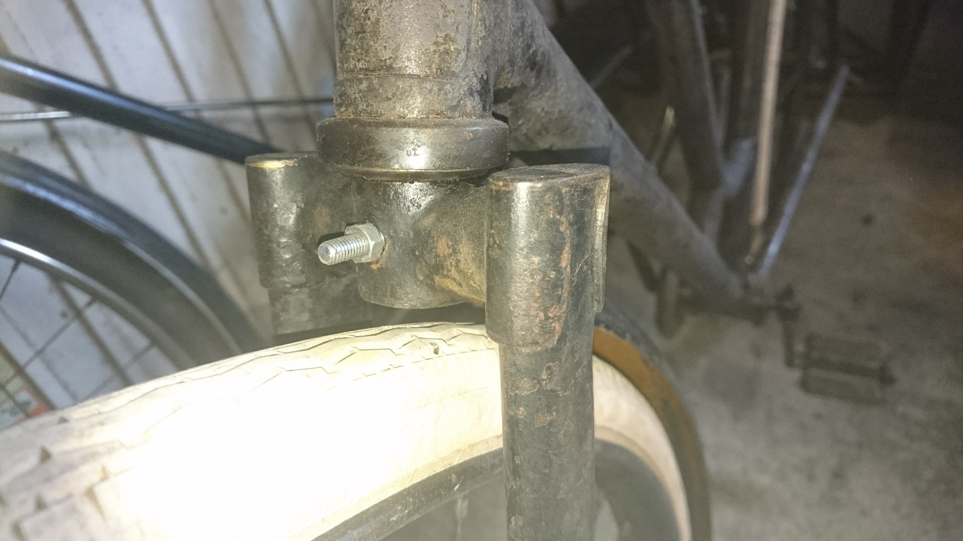 Daarmee dacht ik een heel eind te zijn. Want de niet-originele stempelrem die er op zat wilde ik wel behouden. Alleen het rare geleidebeugeltje op de voorvork zou ik graag vervangen door het sierlijke beugeltje van Burgers. Maar wat bleek: er paste helemaal geen remblok tussen de voorvork en de band. Ter vergelijking een foto van de Deventer-fiets: