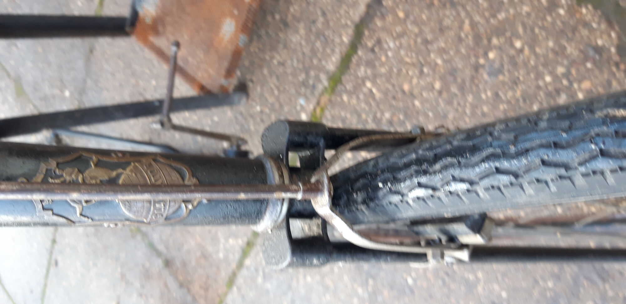 Deze Gladiator is vast later. De folder toont een volledig gelugd frame, de fotos zijn van een frame waarbij de lugs bij het balhoofd niet meer aanwezig zijn