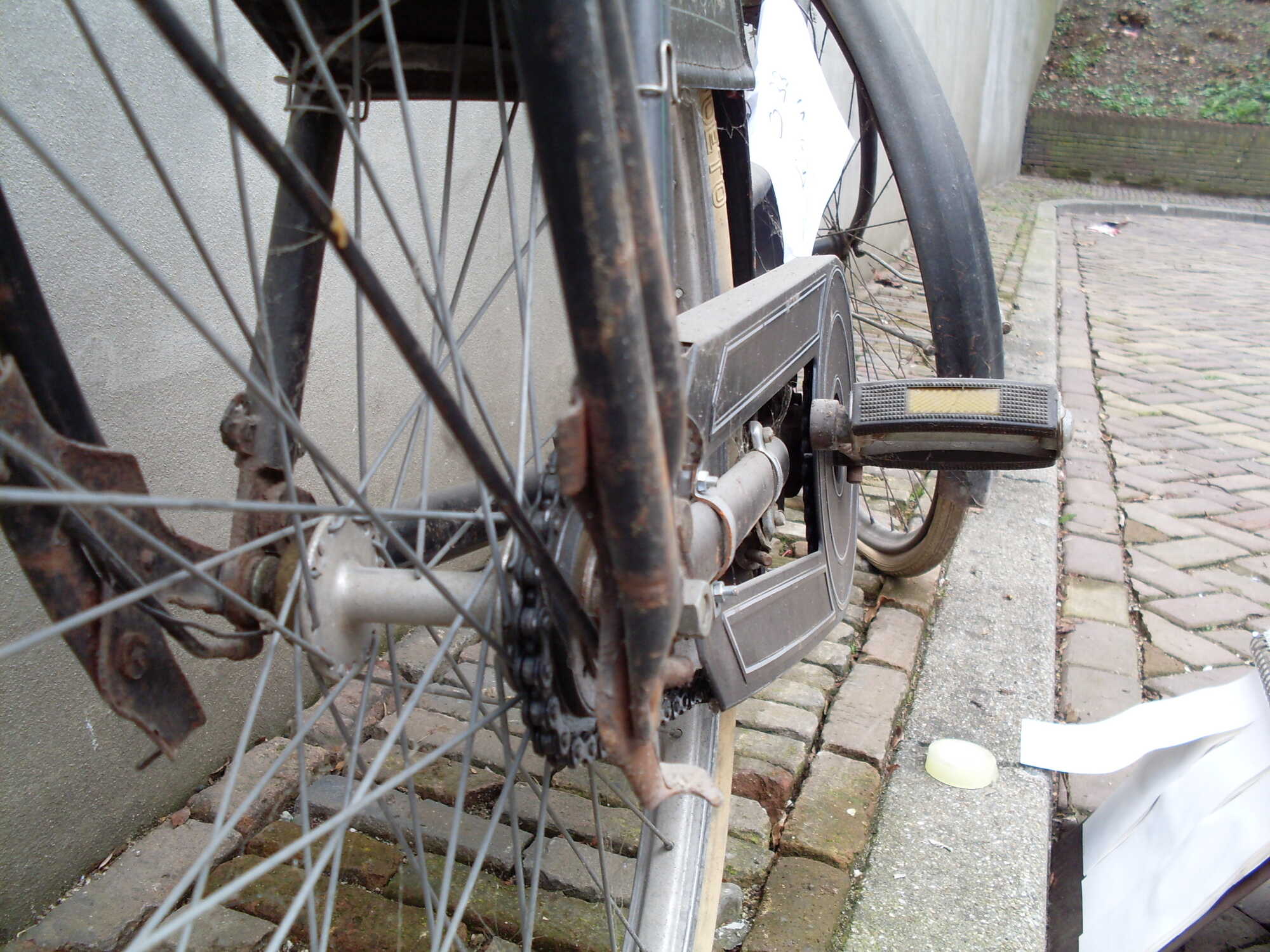 1. Ooit zat er het remsysteem op met de nokjes op de voorvork en staande achtervork gelast. Bij de achterste nokjes 'hangt' zelfs nog een onderdeel van het originele remsysteem.
