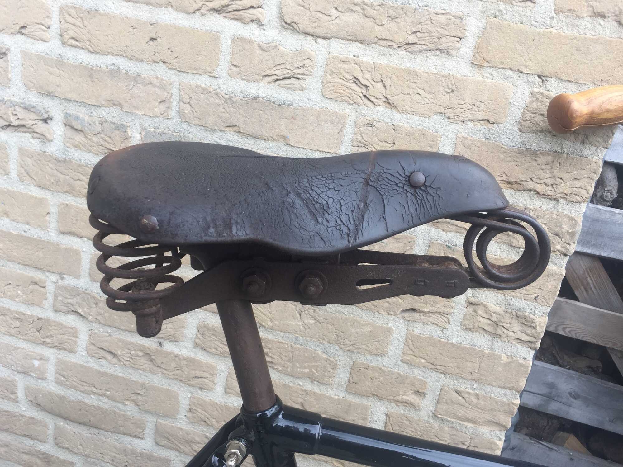 Het zadel kwam met de fiets mee. Het mistte de spanbout en het leer was uitgedroogd maar dat was nog goed te verhelpen. Het oogt oud maar functioneert prima.