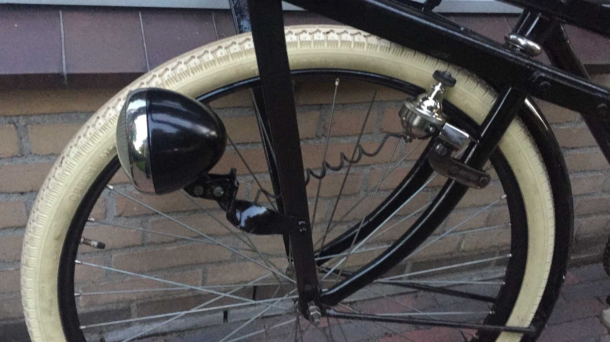 De fiets is inmiddels voorzien van de pedalen, een dynamo en een koplamp met een vernikkelde rand.
