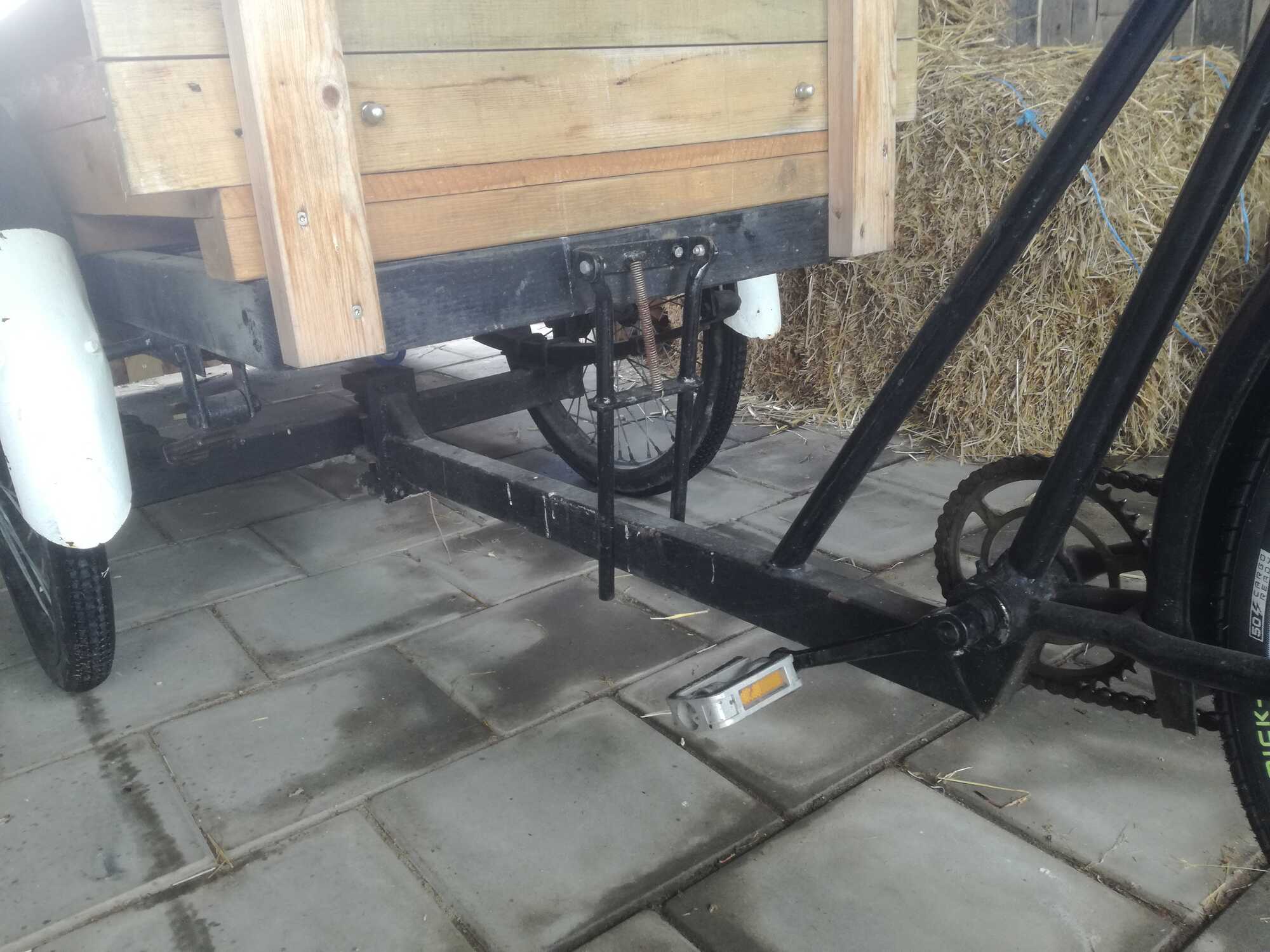 Aan het kokerbalkframe kan ik zien dat het geen hEEl oude is, maar ben wel nieuwsgierig. Er is wel het een en ander, waaronder het remsysteem, op betrekkelijk vernuftige wijze -zij het met wat minder respect voor de originaliteit- aan verbouwd. Hij heeft drie 26" wielen.