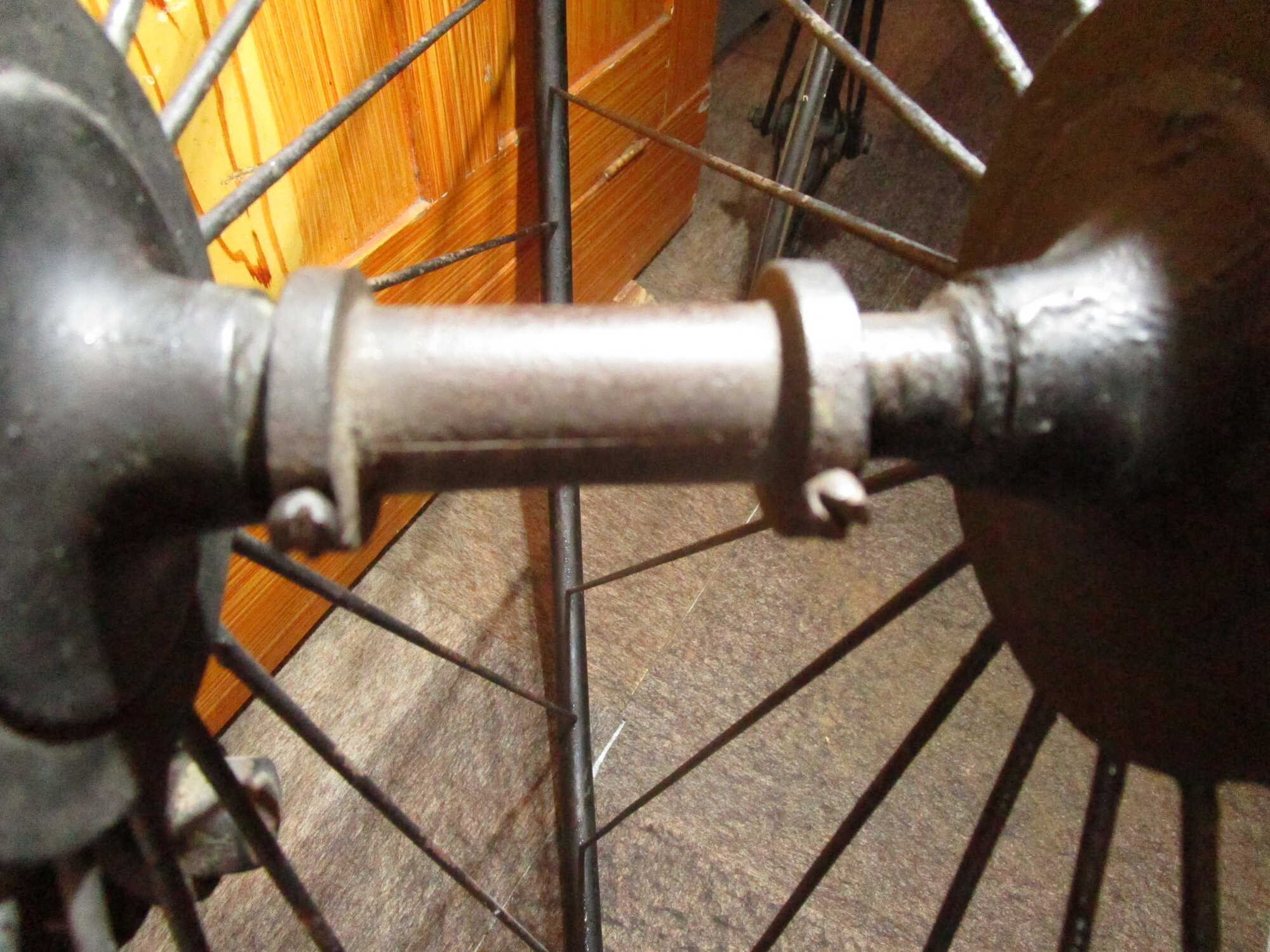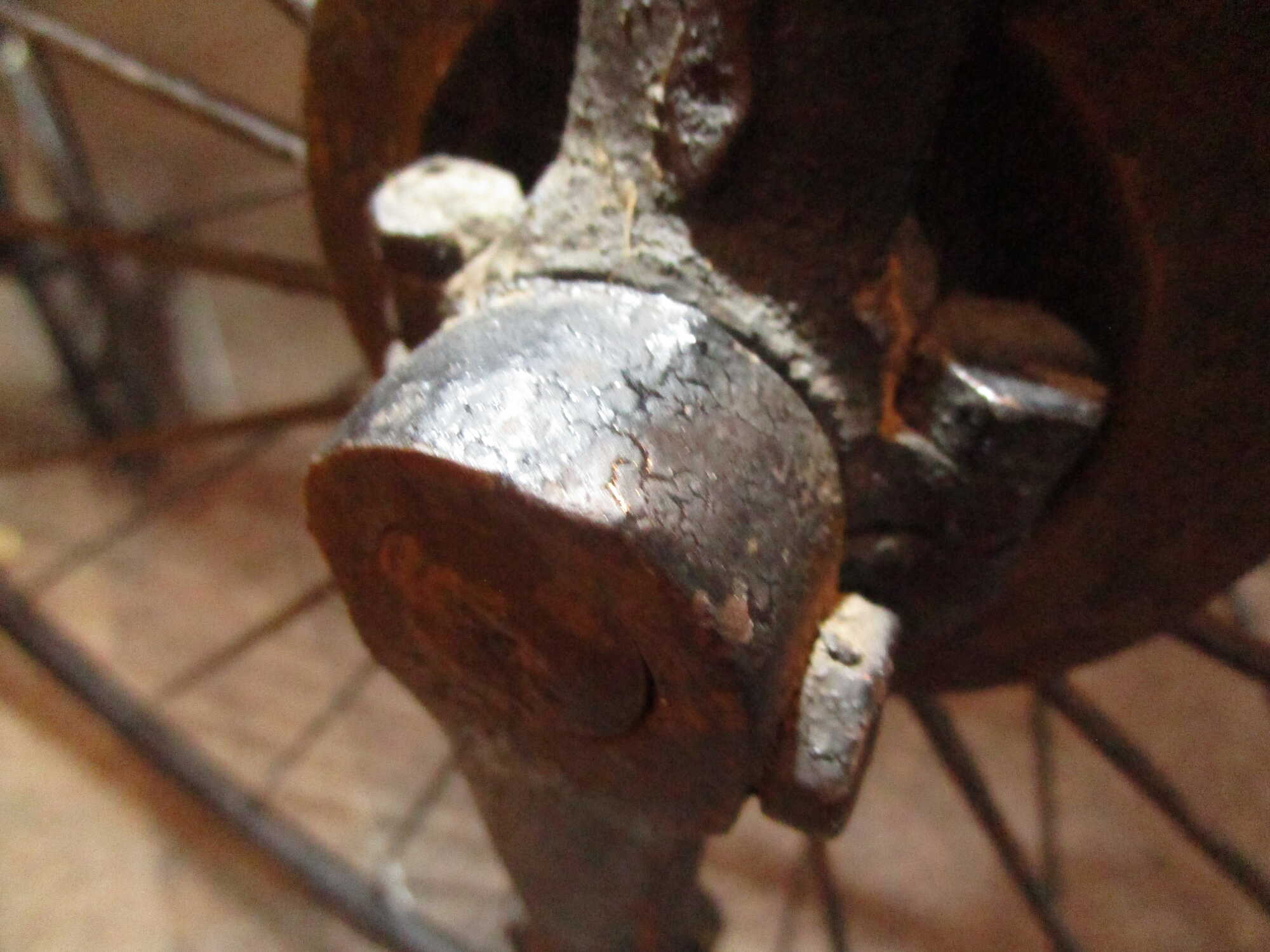 Er heeft zelfs een lamp in de voornaaf gehangen gezien de bracket die op de naaf geschroefd zit. Ik zou me kunnen voorstellen dat dit inderdaad een fiets voor een kleine volwassene is geweest.