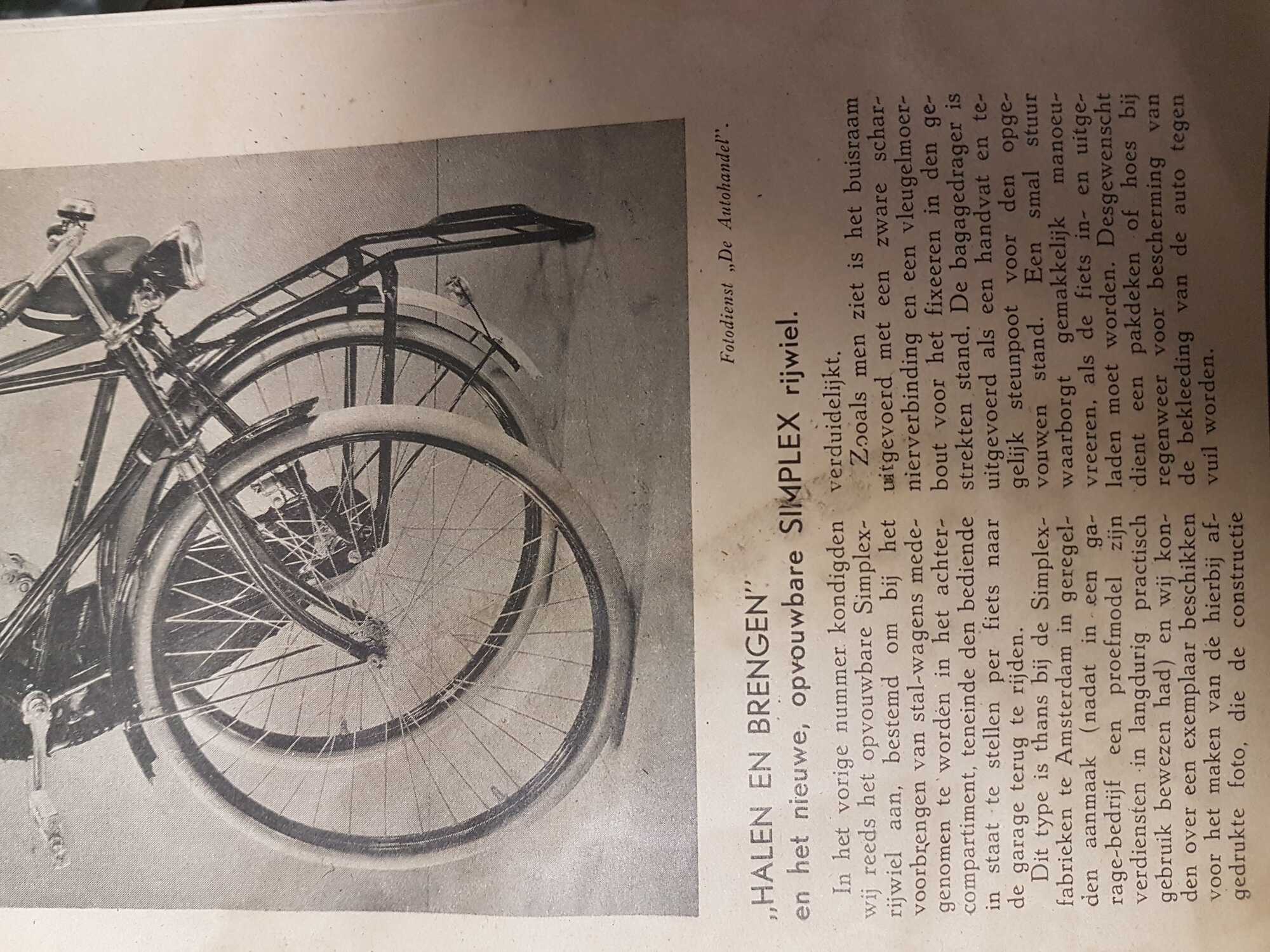 ik heb even in delpher.nl gekeken. In de jaren 30 was het inderdaad gebruikelijk om je auto zeker in de winter niet voor de deur te laten staan maar in een garage te stallen. Zie onderstaande advertentie uit het Algemeen Handelsblad van 20-11-1931. Als je hem nodig had werd hij dan voor de deur gebracht. De werknemer van de garage moest vervolgens weer terug en daar was deze vouwfiets voor bedoeld. Uit het artikel blijkt dat Simplex dit model echt in productie heeft gehad. Ik ben benieuwd of er nog een keer een exemplaar opduikt.