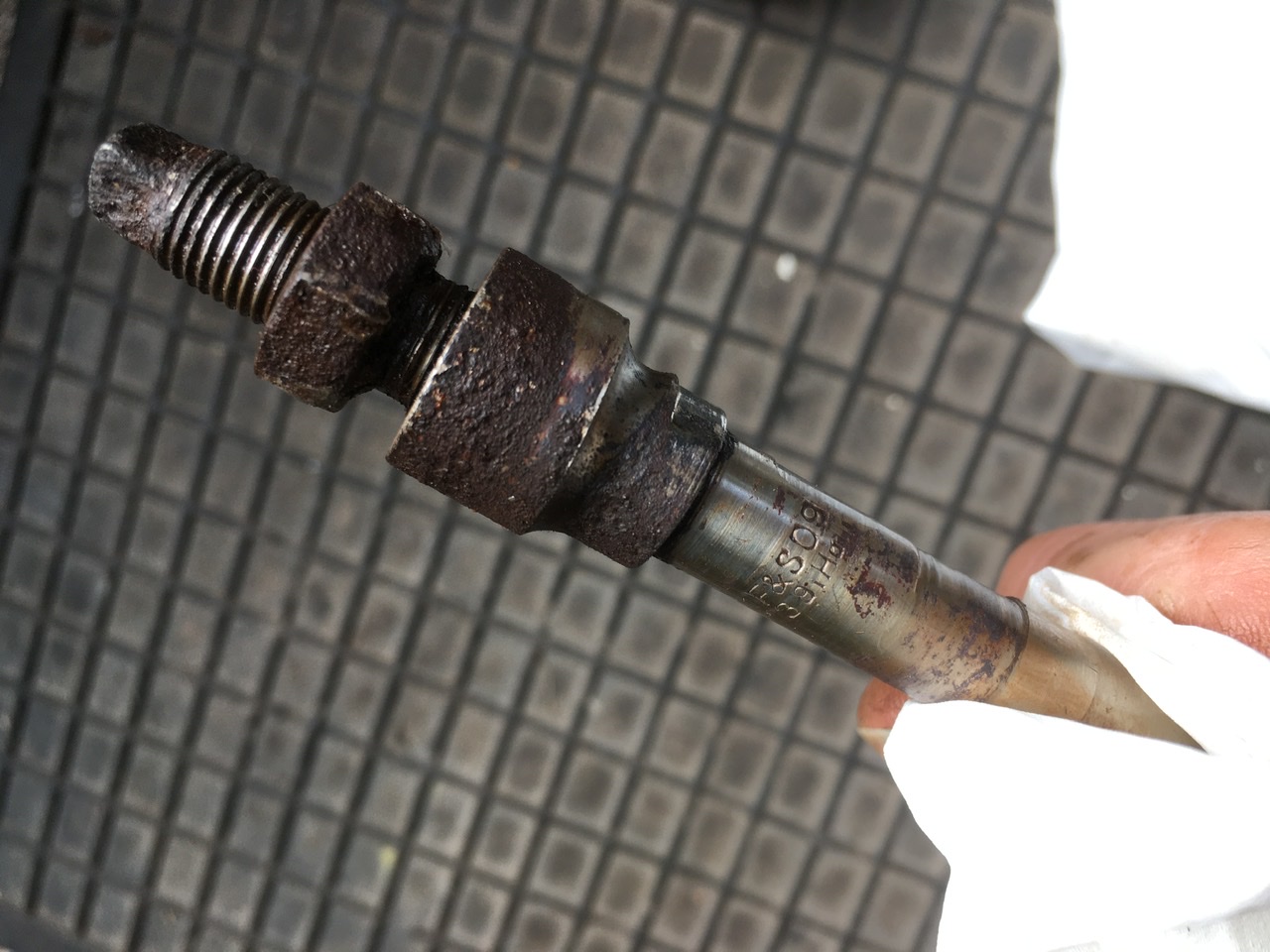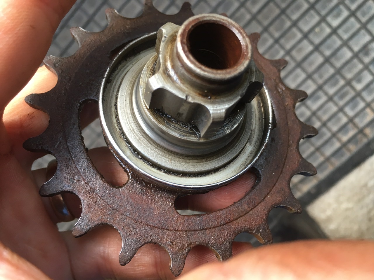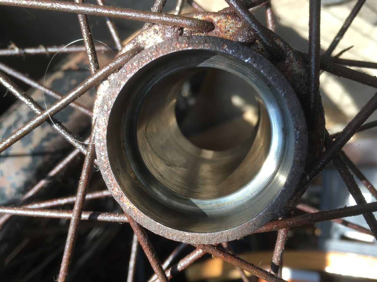 Helaas kwam het slechtste gedeelte van alles als laatste te voorschijn: de tandwiel-kant van de as. Aan een kant helemaal weggeroest. De fiets heeft denk ik echt heel lang stilgestaan. Ook is er wat verwering te zien op de naaf waar de hoofdkogellagers op rollen. Ik weet niet of deze nog evt. bruikbaar is? Ik bewaar alles voor de zekerheid. As is wel sowieso naar de knoppen helaas.