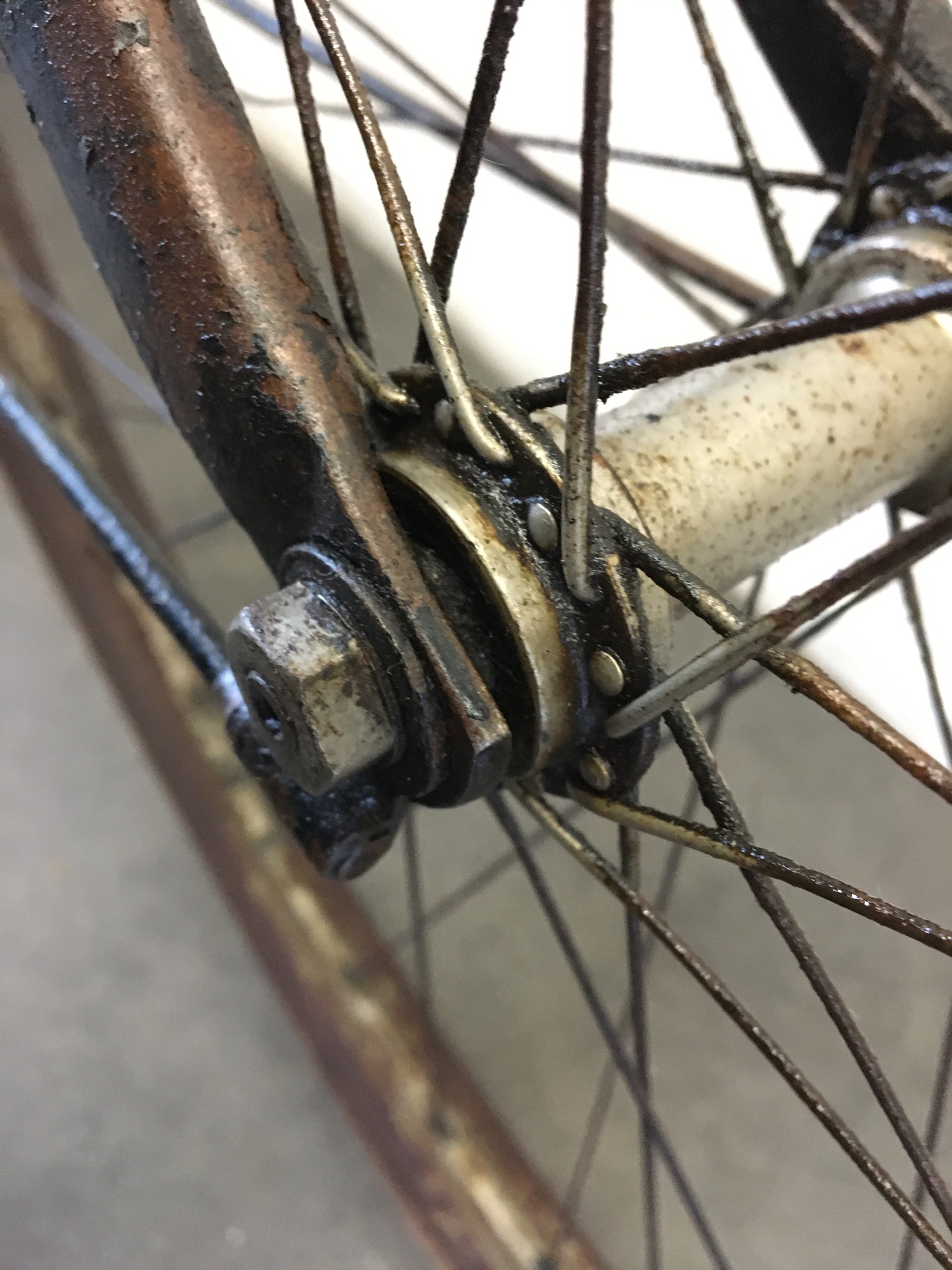 Behalve dat het gewoon een mooi oud ding is is er ook iets speciaals aan deze fiets. Er zitten /zaten namelijk naven in van de duurdere soort met links en rechts draaiende stofkappen. Ik heb het vermoeden dat Fongers deze naven zelf maakte. In mijn vroege Fongers fietsen (2 stuks ) zitten de naven gemerkt met Fongers en omdat het in de periode van deze DZ oorlog was in Europa kon Fongers niet meer aan de buitenlandse goedkopere naven komen.