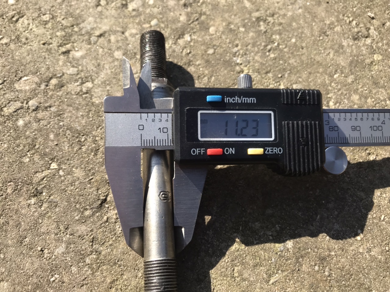 Het is een as met gerolde draad. Door de draad in de as te rollen komen de toppen omhoog en gaan de dalen omlaag. De asdiameter is dus niet zo boeiend. De draaddiameter is bijna 12mm, minus een tolerantie. En Union zal metrisch zijn? Volgende stap is proberen of je een metrisch boutje met dezelfde spoed (M6=1mm?) kunt vinden, dan kun je ze in elkaar leggen zonder dat het wiebelt