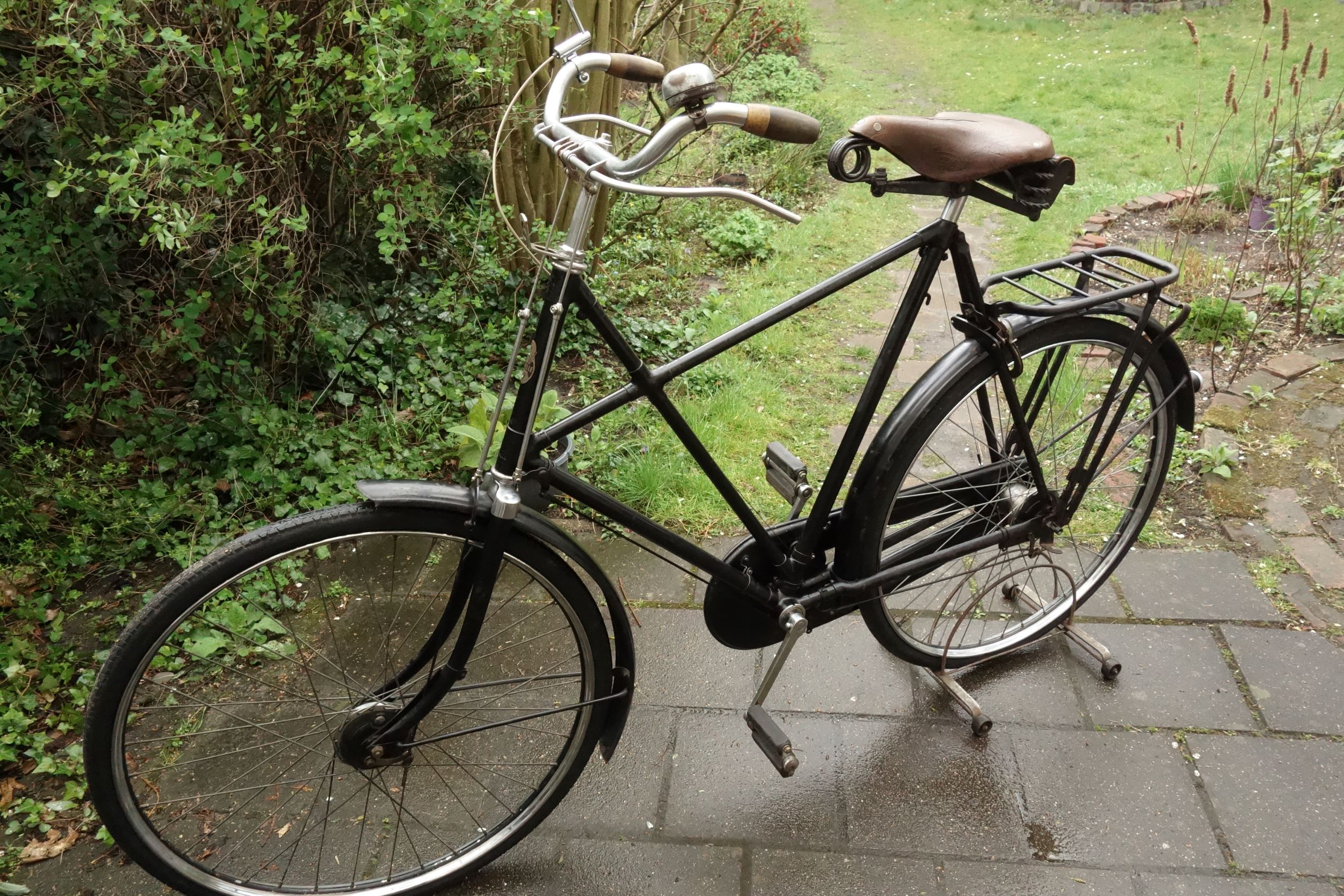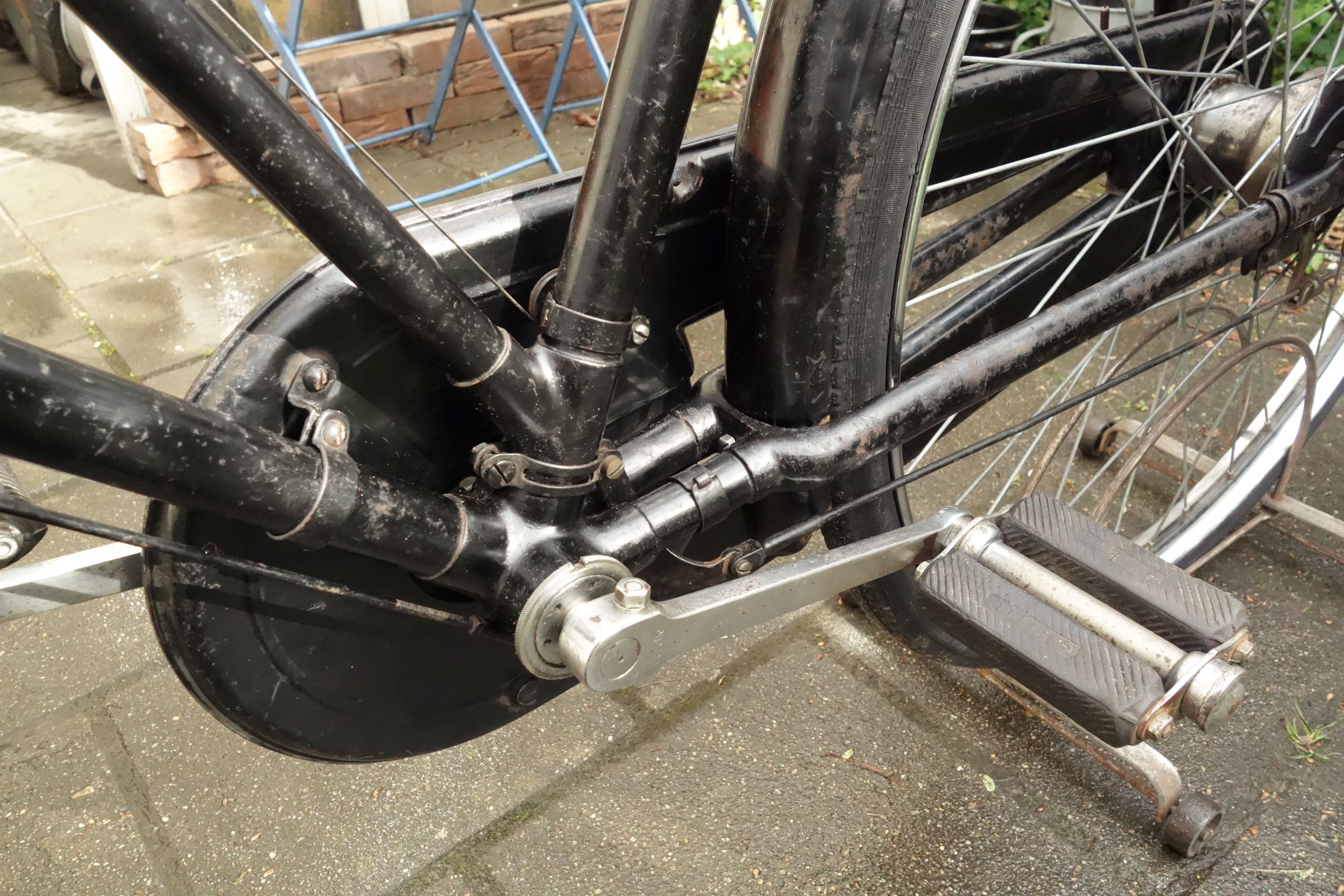 Deze fiets heeft een trommelrem voor uit 1933 en achter een KB 4 naaf dus uit 1934. Gelukkig zit het oorspronkelijke binnenwerk er nog in.