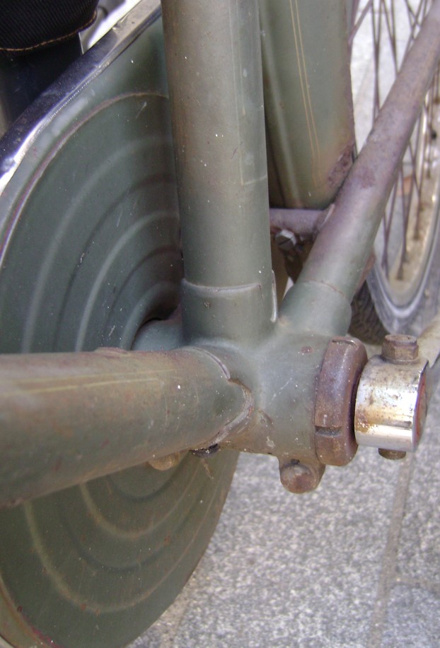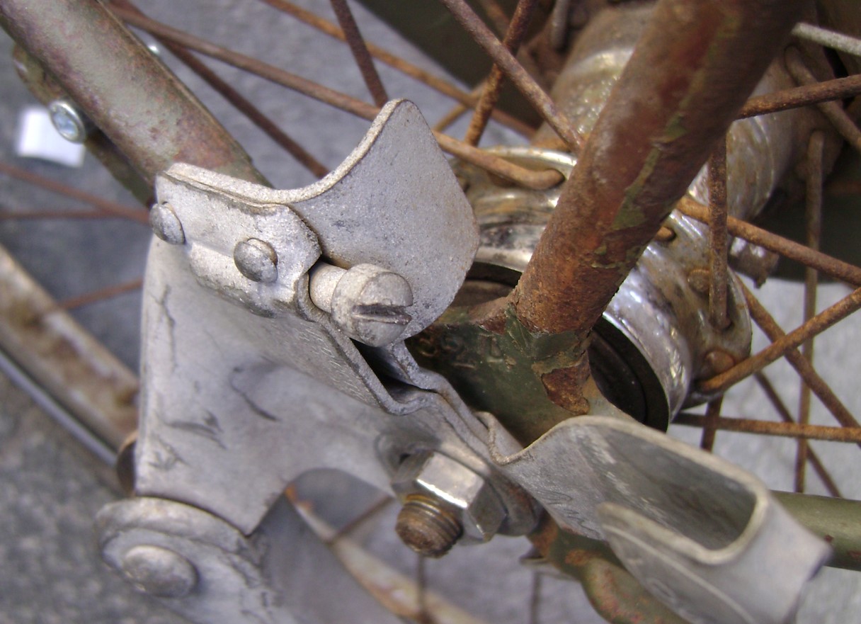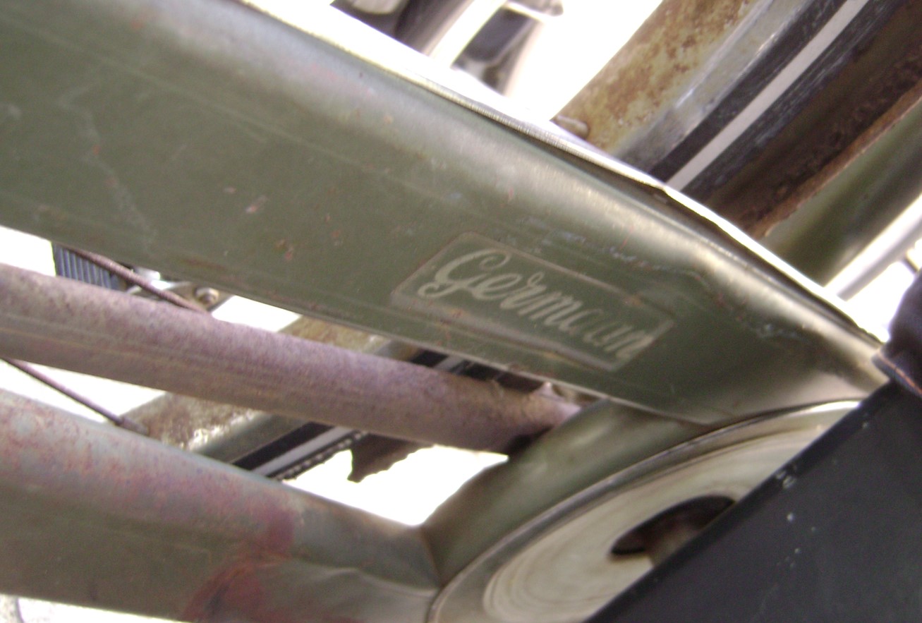 Ik deel hierbij wat foto's van wat het bleek te zijn; een Germaan "royal" sportfiets van 1954 (althans, de achternaaf, maar dat lijkt wel plausibel). Helaas is de staat niet al te best en mist er vooral het e.e.a. aan de voorste helft, maar ik acht hem toch zeldzaam genoeg om interessant te zijn. Ook stond hij nog eens flink in gebouwd, dus een compleet plaatje is er niet...