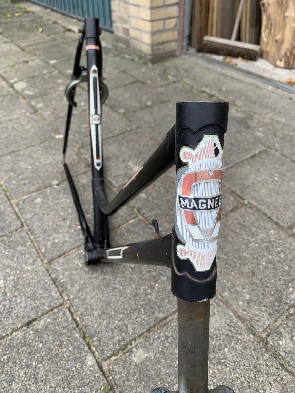 Ik heb een frame en voorvork van een Magneet Friendship 26" uit de jaren 60 over, waarvan de lak nog heel gaaf is. Weliswaar dof, maar dat kan opgepoetst worden. Dit zijn de restanten van de fiets die ik voor donoronderdelen gestript heb.