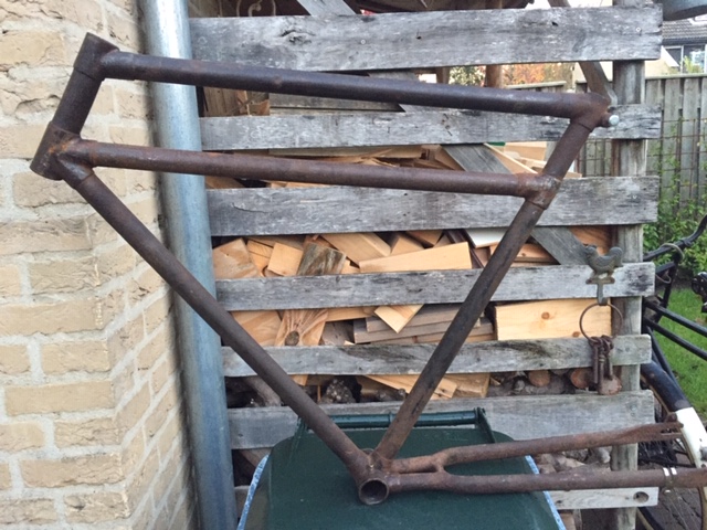 Het merk van deze frames weten we helaas nog niet. Er zijn er een stuk of 4 van bekend, dus zeker een groter merk, en geen kleine lokale maker. Dit is ook de eerste die nog redelijk kompleet is. Tot nu toe waren het alleen losse frames, of zwaar verbouwd.