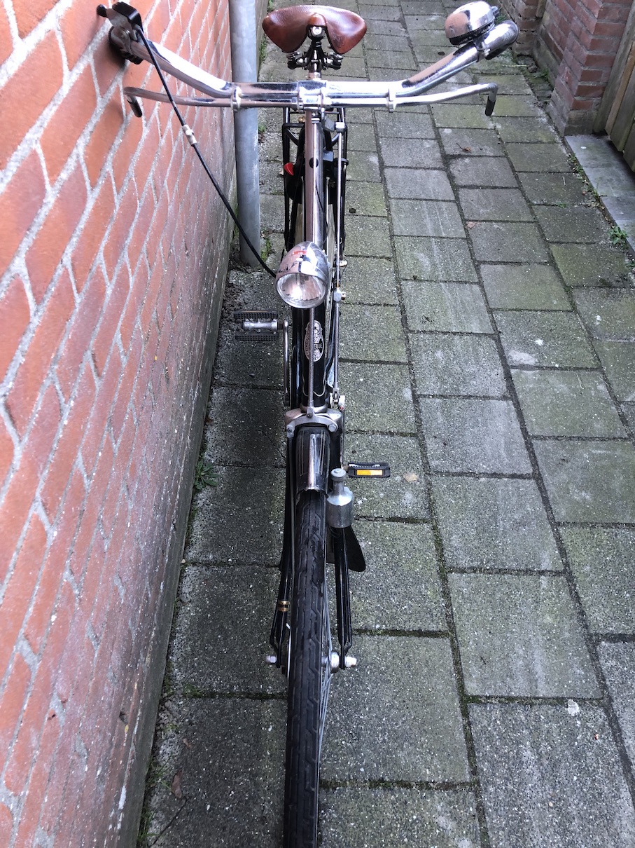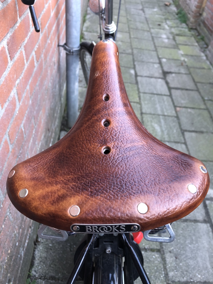 Zoals te zien heeft de fiets een mooi Brooks zadel. Altijd goed onderhouden en het onderhoudskitje krijg je erbij.