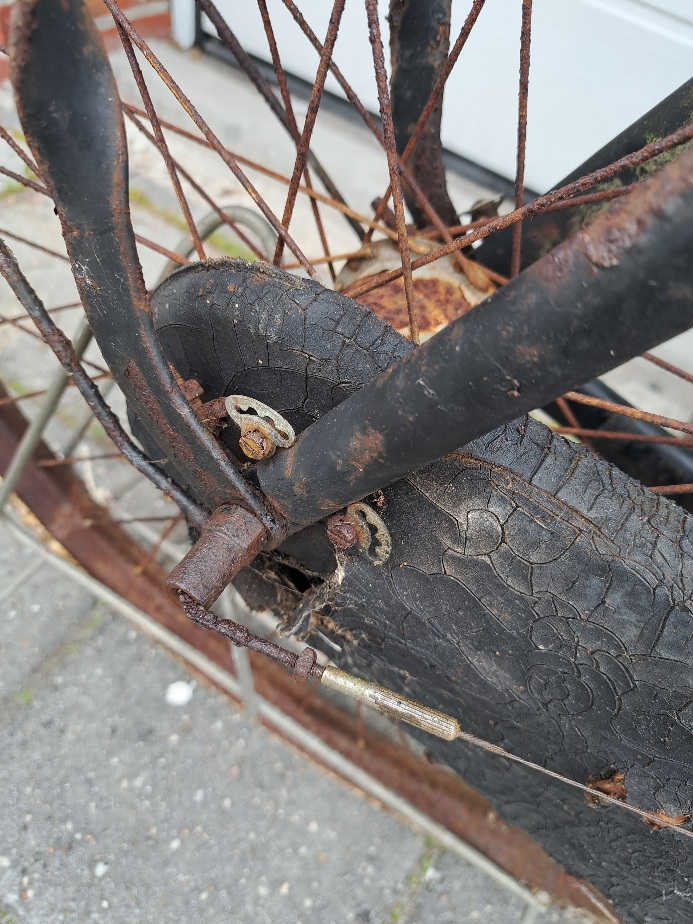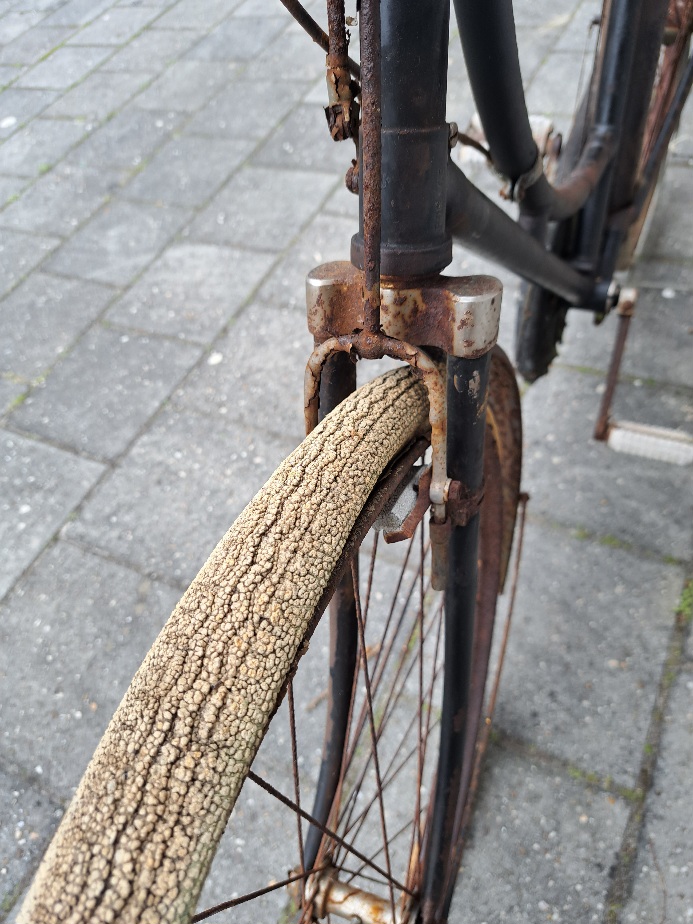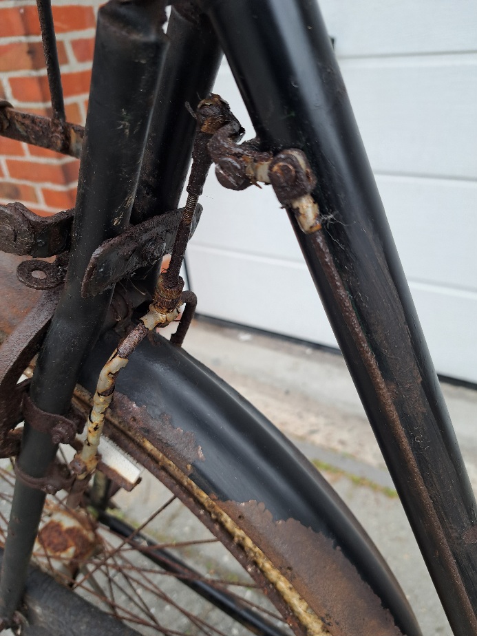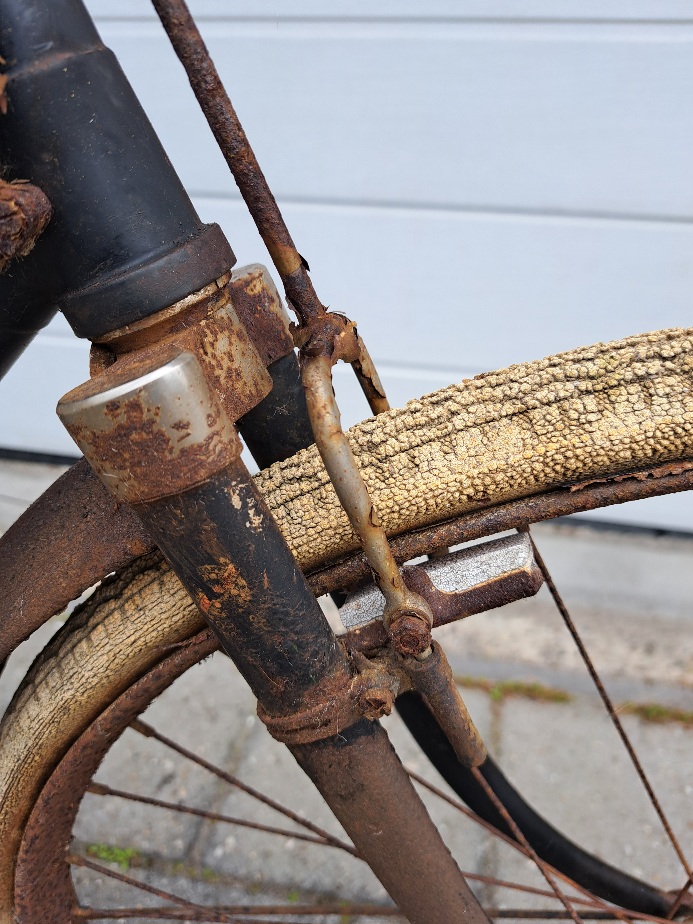 Gelukkig zijn het frame, de stuur en de spatborden niet doorgeroest en is alles nagenoeg origineel.