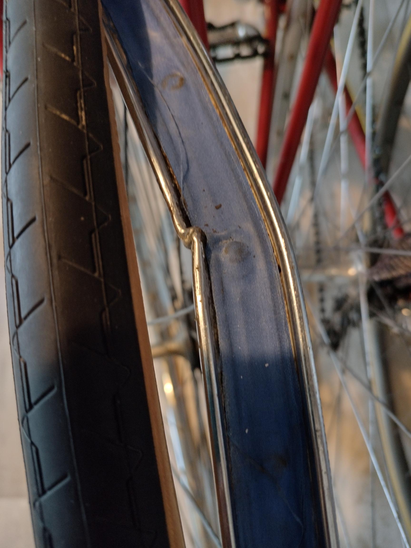 Voor alles is een eerste keer? Net banden opgepompt van mijn 1985 Batavus Club Racer, binnenshuis. Vijf minuten later zat ik met m'n hoofd tot aan het plafond van schrik. Klapband, maar niet de buitenband heeft schade: de aluminium velg is letterlijk aan gort geblazen.