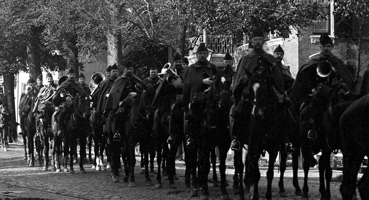 Ik zie nu op transportfiets.net dat de oorspronkelijke foto veel groter is. Daar is het regiment militairen vee beter op te zien en ook een kenmerkend gebouw.