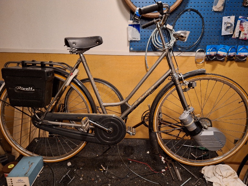 fietsemaker, met een "R" op de bel - van Rivel, neem ik aan - en voor de rest lijkt de fiets veel op deze e-fiets; zelfde type kettingkast, zelfde achterlicht enzovoort.