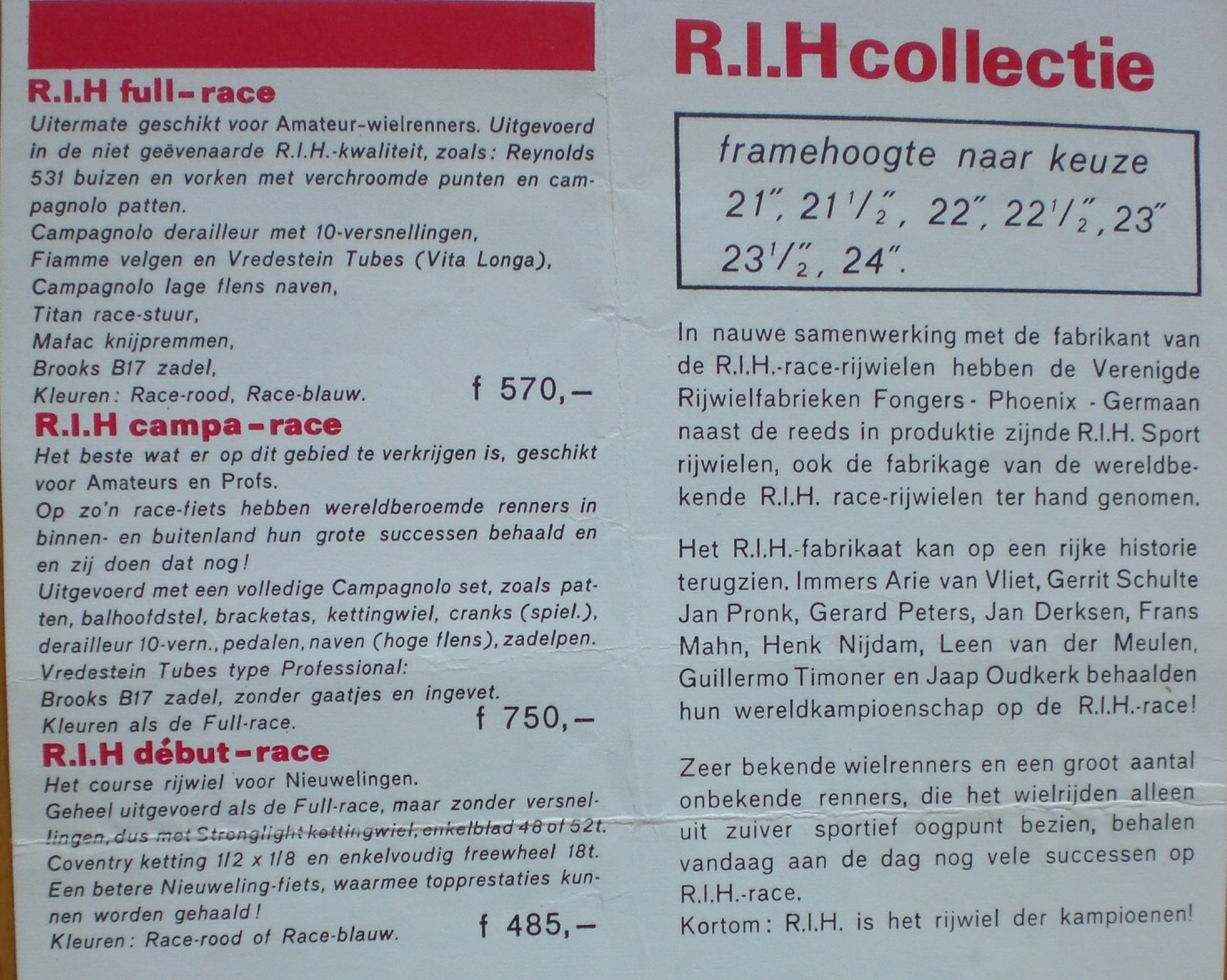 Het frame was beter dan de rest, dus de fietsen die je tegenkomt hebben vaak vele upgrades gehad zodra het zakgeld het weer toeliet. Dus als je los gaat met Campagnolo derailleurs etc heb je nog steeds een goed verhaalTonTon schreef: ↑2 feb 2024, 16.09Bedankt voor jouw reactie en nu weet ik alvast welk stuur, zadel, remmen en derailleur er op moetm-gineering schreef: ↑2 feb 2024, 15.59je hebt een fongers rih uit '65 (A)TonTon schreef: ↑2 feb 2024, 15.22 Onlangs ging ik een Locomotief racefiets project ophalen en daar had de verkoper nog twee raceframes staan van het merk RIH. Van de oudste plaats ik later foto’s in een nieuw onderwerp. Mijn vraag is, hoe kleed ik deze RIH verder aan? Dus welke wielen, remmen, stuur, zadel, remgrepen, trapas, trappers, tandwielen etc moet ik op deze RIH plaatsen om hem weer zoveel mogelijk authentiek te krijgen. Het framenummer op het balhoofd is 147A en op het andere frame staan 4 cijfers zonder letter. Alvast bedankt voor jullie moeite.