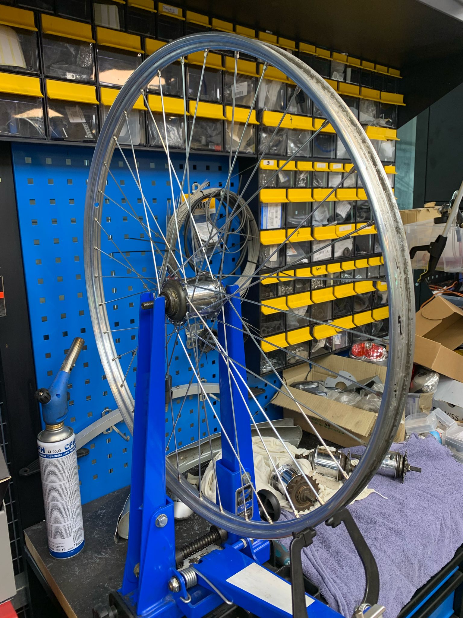 Vandaag heb ik een SA 3v AW-naaf uit 1960 in een aluminium velg gespaakt. Deze velg heb ik via dit forum gevonden (van Piet Munsters), en deze paste precies bij het wiel dat al in de Empo omafiets uit 1958 zat. Deze fiets heb ik al een keer op dit forum laten zien en hij is met dit bijna originele wiel zo goed als klaar voor zijn eerste historische rijwieltocht
