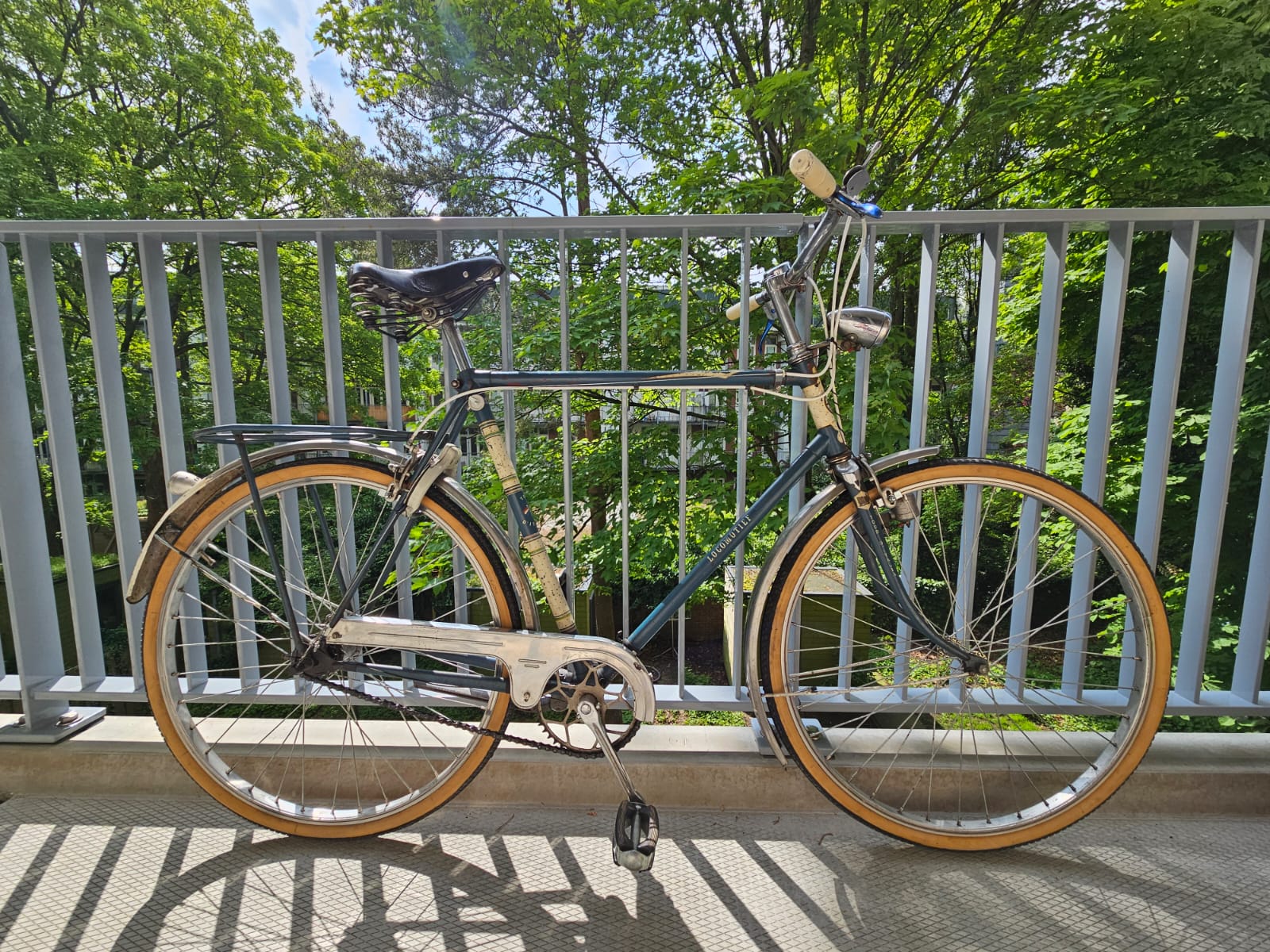 Hierbij ook een foto van mijn eerste opknapproject. Een Locomotief Tour d'Italia uit 1957, die eind vorig jaar vrij lang op Marktplaats heeft gestaan en waar ik inmiddels erg aan gehecht ben. Er zat een naaf zonder versnellingen in met een nogal gammel freewheel, en die stalen velgen met velgremmen remden ook niet heel lekker. Ik heb aluminium velgjes gekocht en er een nog heel mooi lopende SA 3-speed uit 1954 in gespaakt.