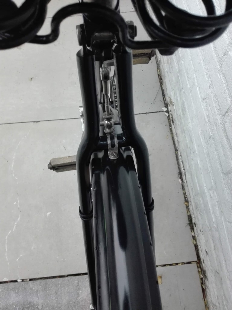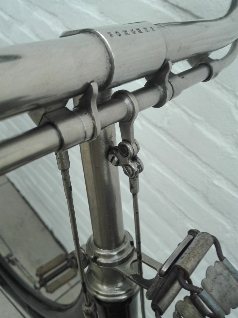 Wat ik ook heb aangepast is de lengte van de remstangen van het balhoofd. Op alle beschikbare fotos zijn die veel langer dan tot nu op deze fiets zat gemonteerd. Dat is denk ik fout gegaan bij revisie van de fiets in de fabriek destijds. Nu zijn ze weer mooi op lengte. Ook de remblokken waren vervangen door iets van een ander merk. Er horen vernikkelde open remschoenhouders op. Voor heb ik gedaan en achter moet nog. De latere fietsen hebben zwarte remschoenhouders met vernikkelde asjes en schroeven.
