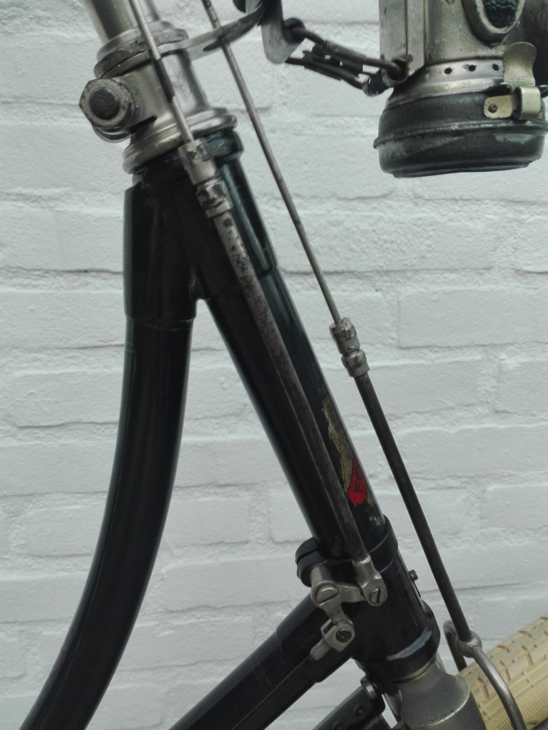 Over het balhoofdtransfer: op de zwarte lak (opgeruwd ter plekke) heb ik een nieuw transfer aangebracht. Dat knalt er natuurlijk uit door de heldere kleurstelling (goud en rood), wat niet past op zo'n oude fiets. Vervolgens een beetje beschadigd aan de zijkanten en van flinke afstand er een zwarte nevel op gespoten. Per saldo geeft dat een gedempte/ gebruikte aanblik.Hetzelfde heb ik gedaan bij de goudgeverfde modelcode en het framenummer.