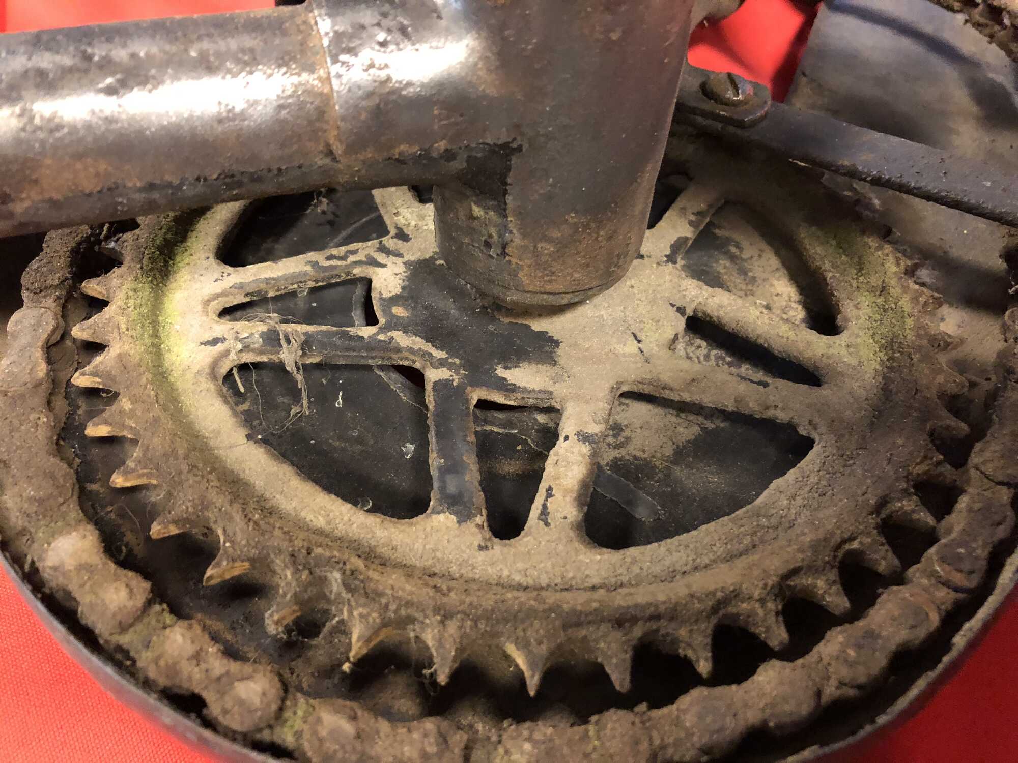 Ik ben heel benieuwd. Ook delen als de trapas bijvoorbeeld zijn interessant (vind ik ;) ). De fiets is voor zover ik kan zien ooit overgeschilderd. Het zou interessant kunnen zijn of met verfafbijt nog delen van de originele lak eronderuit te krijgen. Maar dat laat ik aan jou over hoe je dat aanpakt.