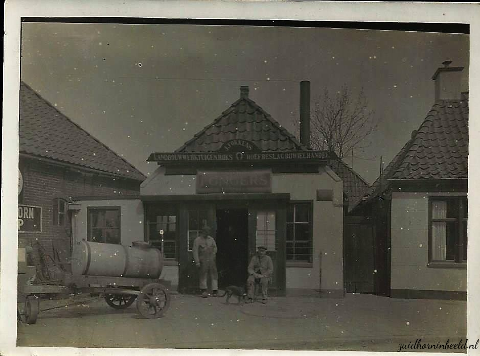 Boven de deur staat te lezen: landbouwwerktuigen,(dan iets wat ik niet kan ontcijferen vier letters), hoefbeslag en rijwielhandel.