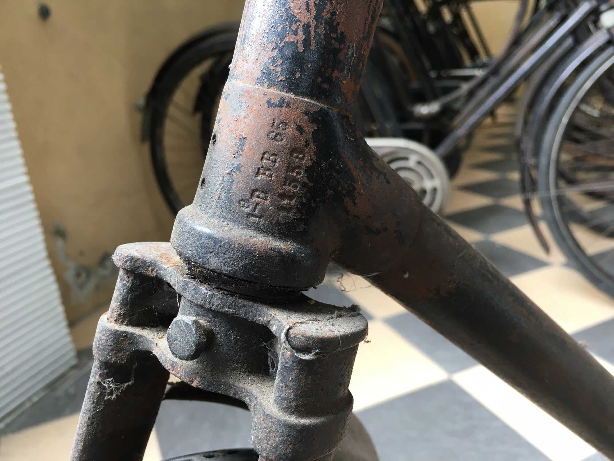 En aanvullend, de achterpatten op het kruisframe zijn niet van het model van de jaren '30 maar hebben nog het 'inkepingkje' van de vroegere modellen. Deze achterpatten zou ik niet op de fiets verwachten als er in de 2e helft van de jaren '30 een aanpassing aan het frame gedaan zou zijn. Misschien een beetje 'wishfull thinking' van mijn kant maar het frame zou zo maar op deze manier geleverd kunnen zijn...