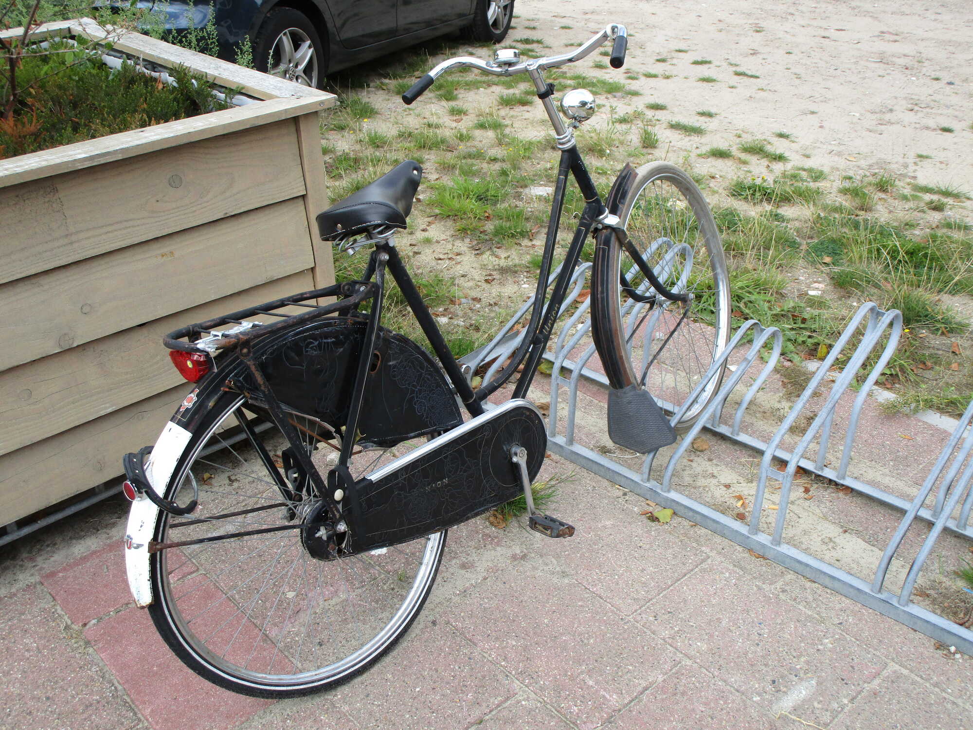 Na vernieling van het achterwiel - waarschijnlijk door één of meerdere derden - is deze fiets verworden tot weesfiets ...
