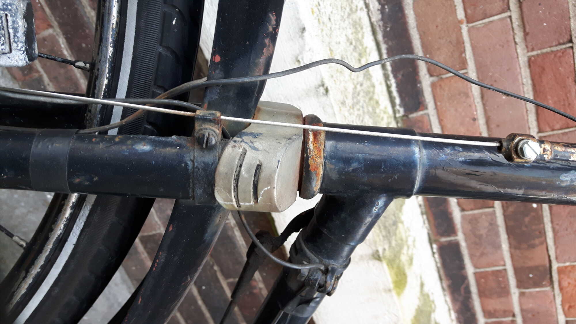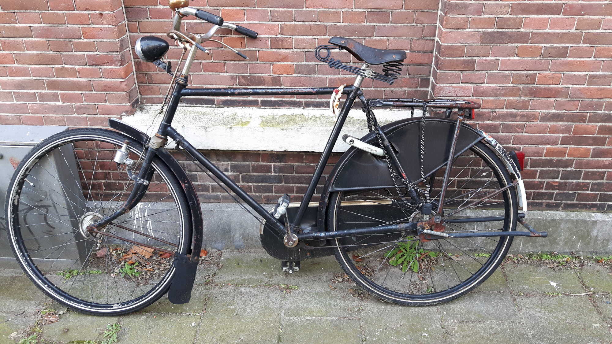 Een vriend van me kwam aan met deze herenfiets. Op het eerste gezicht leek het me een weinig bijzondere fiets uit de jaren 50. Op het tweede gezicht lijkt het me een fiets uit de jaren 20 die door de jaren heen bijna al zijn oorspronkelijke onderdelen is verloren en voorzien van stangen-/trommelremmen en een Fongers stuur...