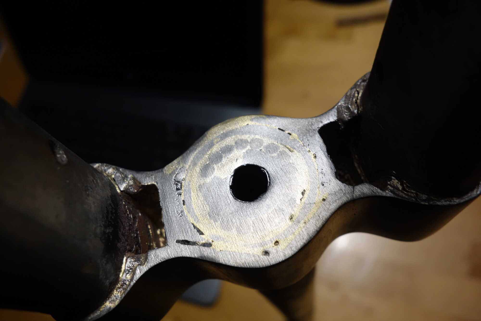 Deze vork had een typisch euvel namelijk de stuurbuis zat niet vast gesoldeerd aan de kroon. Het geheel zat vast met enkele afgebroken laspuntjes en een staafje van plm 5 mm.