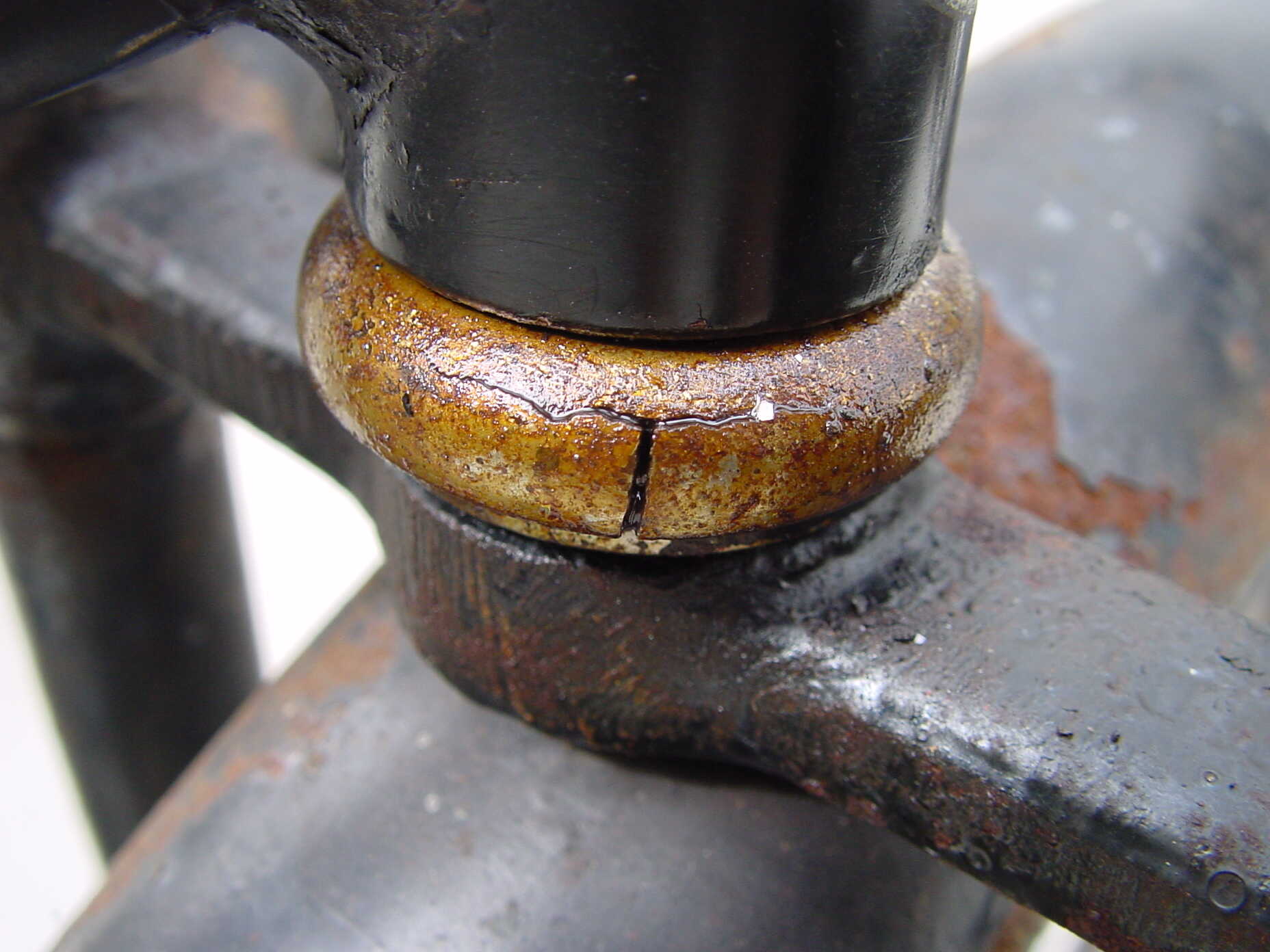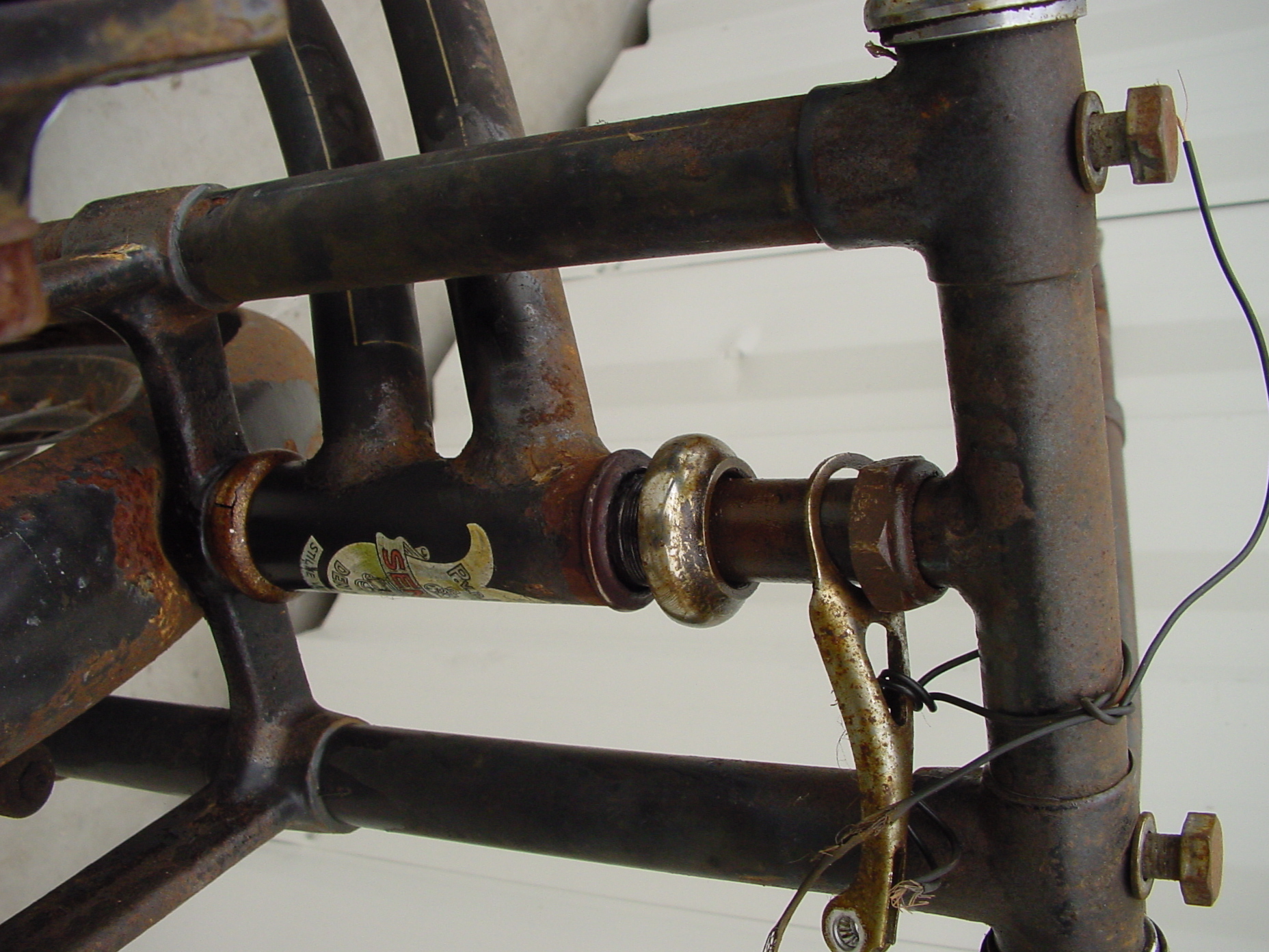 Er zijn echter wel een aantal dingen die er aan moeten gebeuren, zo heb ik geen rem en is er een balhoofdcup stuk. Ook zit er een terugtraprem in het voorwiel wat me ook niet kloppen lijkt. Een doortrapnaafje heb ik nog wel liggen en die ga ik er invlechten. De eerstgenoemde problemen zijn wat lastiger. Ik krijg namelijk het balhoofd niet open, het lijkt mij dat de bovenste twee bouten los moeten en er zit nog een moer in het spatbord. Die zijn nu los en ik zou denken dat nu de hele bovenkant er af moet kunnen. Er zit echter geen beweging in. Het lijkt ook niet echt verroest of zo. Doe ik iets verkeerd?