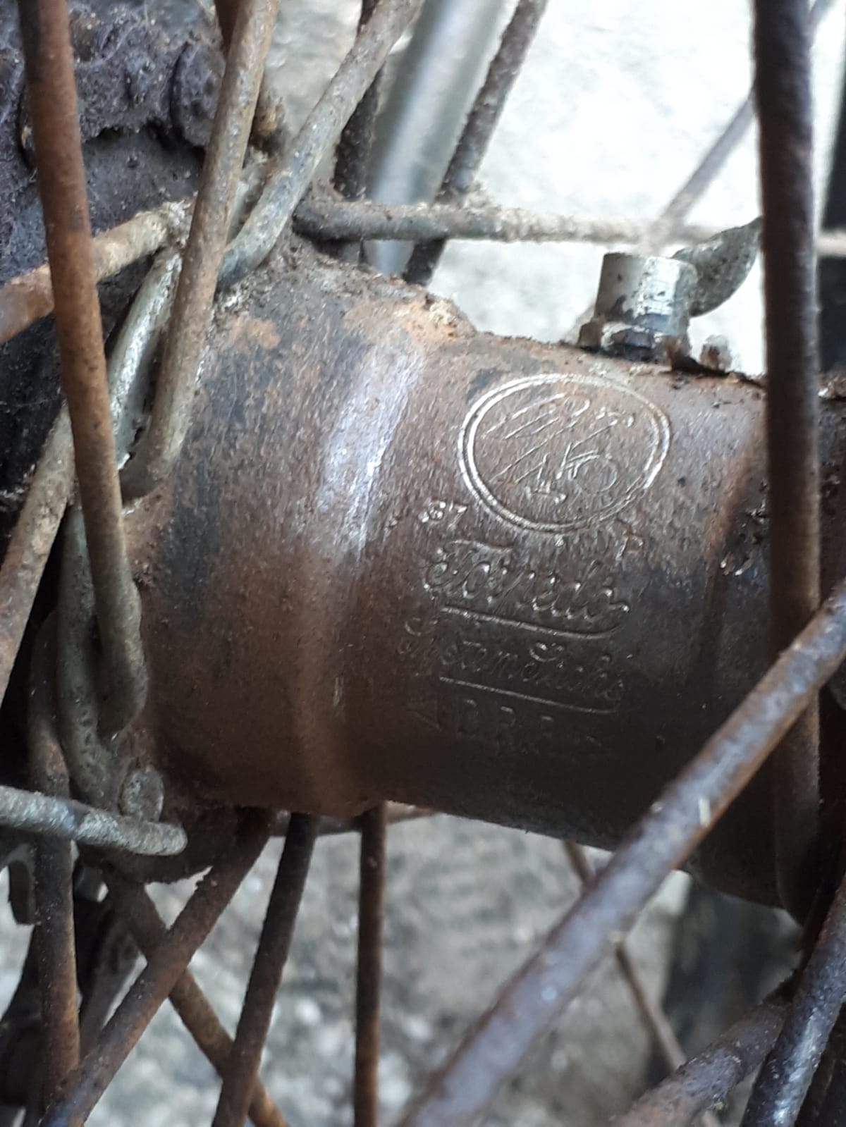 Een bouwjaar zou dan echter wel helpen om er een merk aan te koppelen. Heden middag heb ik dus een poging gedaan om de achternaaf te dateren. Na handmatig met een staalborstel en wat remmenreiniger de nodige zwarte koek te verwijderen, verscheen al snel het logo van Fichtel & Sachs. Links daaronder zijn de cijfers "37" te lezen en rechts staat de letter "P". Gelet op de plaatsing ten opzichte van het logo moet het gaan om een Torpedonaaf geproduceerd tussen 1920 en 1957. De cijfers 37 staan dan voor het bouwjaar (1937) en de letter P voor de partij staal die voor de naaf is gebruikt.