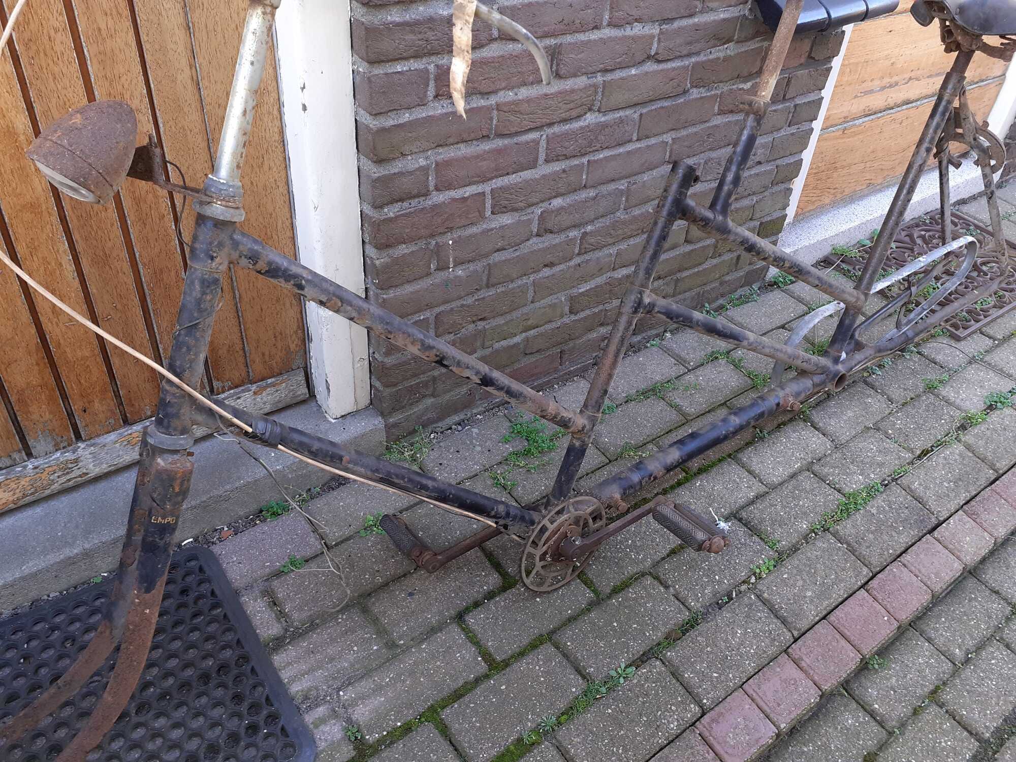 Ik ben eveneens een zoektocht begonnen naar herkomst en merk van een tandem. De gelijkenis met de uwe viel me op, vandaar mijn reactie. Ik heb de fiets van mijn vader gekregen toen ik 12 was ( dat is ondertussen51 jaar geleden). Het was toen al "heel oud ijzer" Ik ging ermee de wereld verkennen maar het is gebleven bij het onveilig maken van de buurt. :D . Speciale kenmerken zijn de verschillende afmetingen van de wielen waarbij het achterwiel de door u genoemde maten heeft. Het voorwiel is niet origineel. Voor het achterwiel kon ik destijds banden vinden bij de plaatselijke fietsenmaker die altijd een paar setjes liggen had voor de fietsen van de postbodes, je weet wel met hun brievenmand boven het (dikkere en kleinere) voorwiel. Voorts vind ik nergens een aanduiding, ook niet op de remnaaf achteraan. Ik heb wél een balhoofdplaatje met de tekening van een stoomschip en de vermelding "déposé".