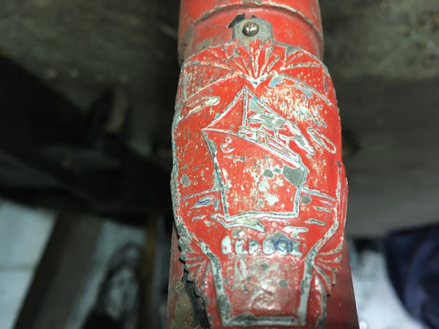 Het merk vind ik lastig in te schatten: een merkplaatje of iets dergelijks kan ik nergens ontdekken. Onder het achterste zadel staat in de framebuis wel een nummer ingeslagen: 1436. Qua onderdelen wordt ik niet meteen veel wijzer: achter vermeldt het remanker van de terugtrapremnaaf "Torpedo Schweinfurt". Aan de voorzijde is een Sturmey & Archer trommelremnaaf aanwezig. Alleen het achterste stuur, zadel en trappers zijn vermoedelijk nog origineel; op de achtertrappers staat "Herup" en het achterste zadel is van het merk Knoop. Ter hoogte van het balhoofd is door het patina heen nog "Brampton England" te lezen. Het plaatje op de koplamp vermeldt "Juncker", maar de lamphaak lijkt me verder niet specifiek voor een bepaald merk. De zwarte lak lijkt oorspronkelijk voorzien te zijn geweest van gele strepen (zo'n 2 mm dik) in rechthoekige vormen.
