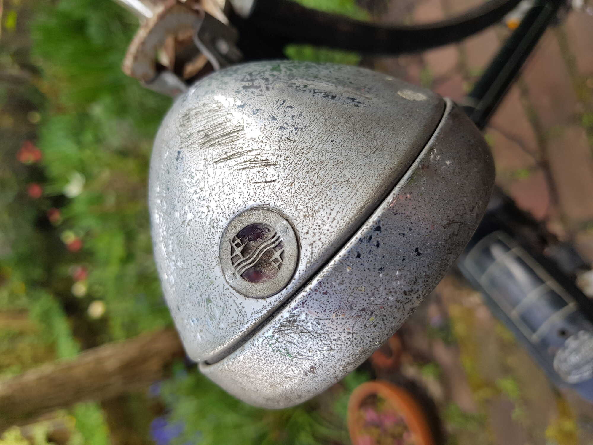 De lamp dateert mogelijk van vóór de oorlog. Bij aanschaf van de fiets is ons er op gewezen dat Philips na de oorlog dit soort lampen - met een 'lichtdoorlatend rood glaasje' aan de bovenkant (zodat je kunt zien of de lamp aan staat) - niet meer gemaakt heeft.