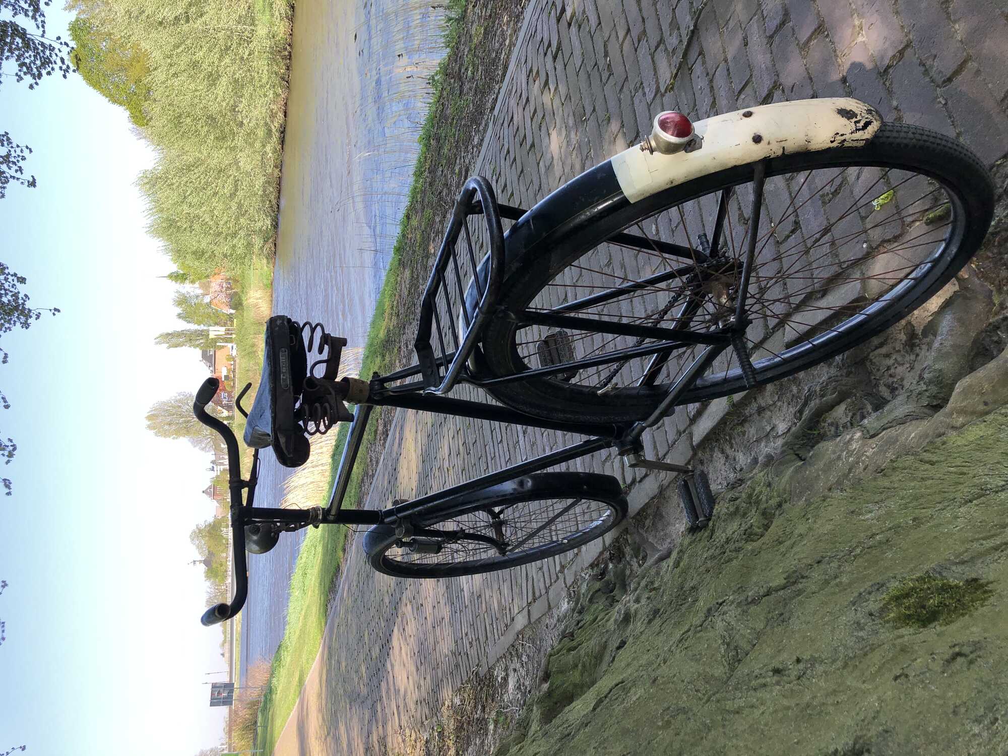 Een prachtige pure "niet te veel aan doen fiets", ja rijdend houden! Wat er wel en niet origineel aan is en welk merk het is, wellicht zegt de lamphaak iemand iets?, geen idee, de fiets geeft een mooi tijdsbeeld van deze overleveraar!