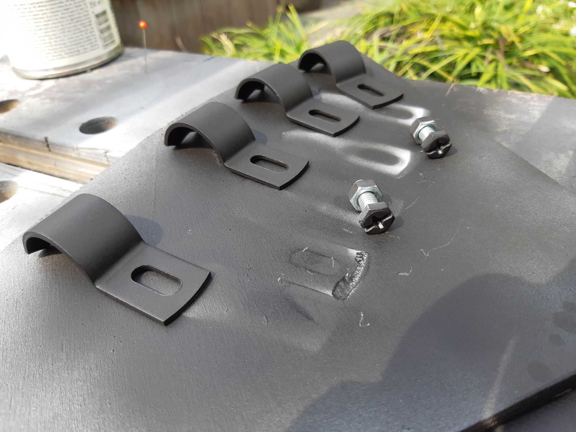 Daarna opzoek naar beugels om ze aan de fiets te hangen. In dit geval werden dat CV beugels die aangepast zijn en daarna gespoten in mat zwart.